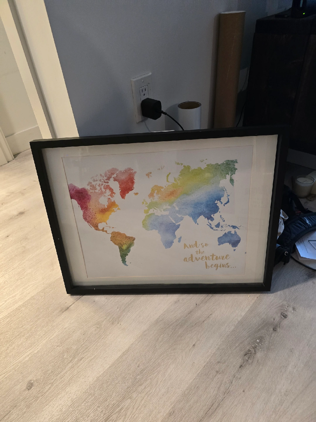 Selling a framed watercolour world map art piece. It says 'And so the adventure begins' in gold lettering. Perfect for adding a touch of wanderlust to any room! love it just havent gotten around to hanging it up for like a year so its gotta go!