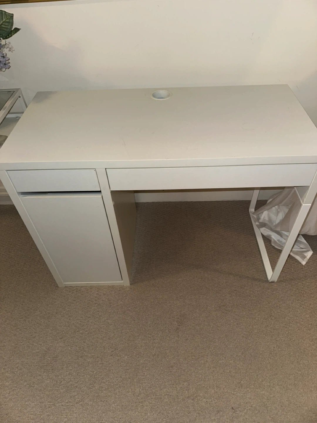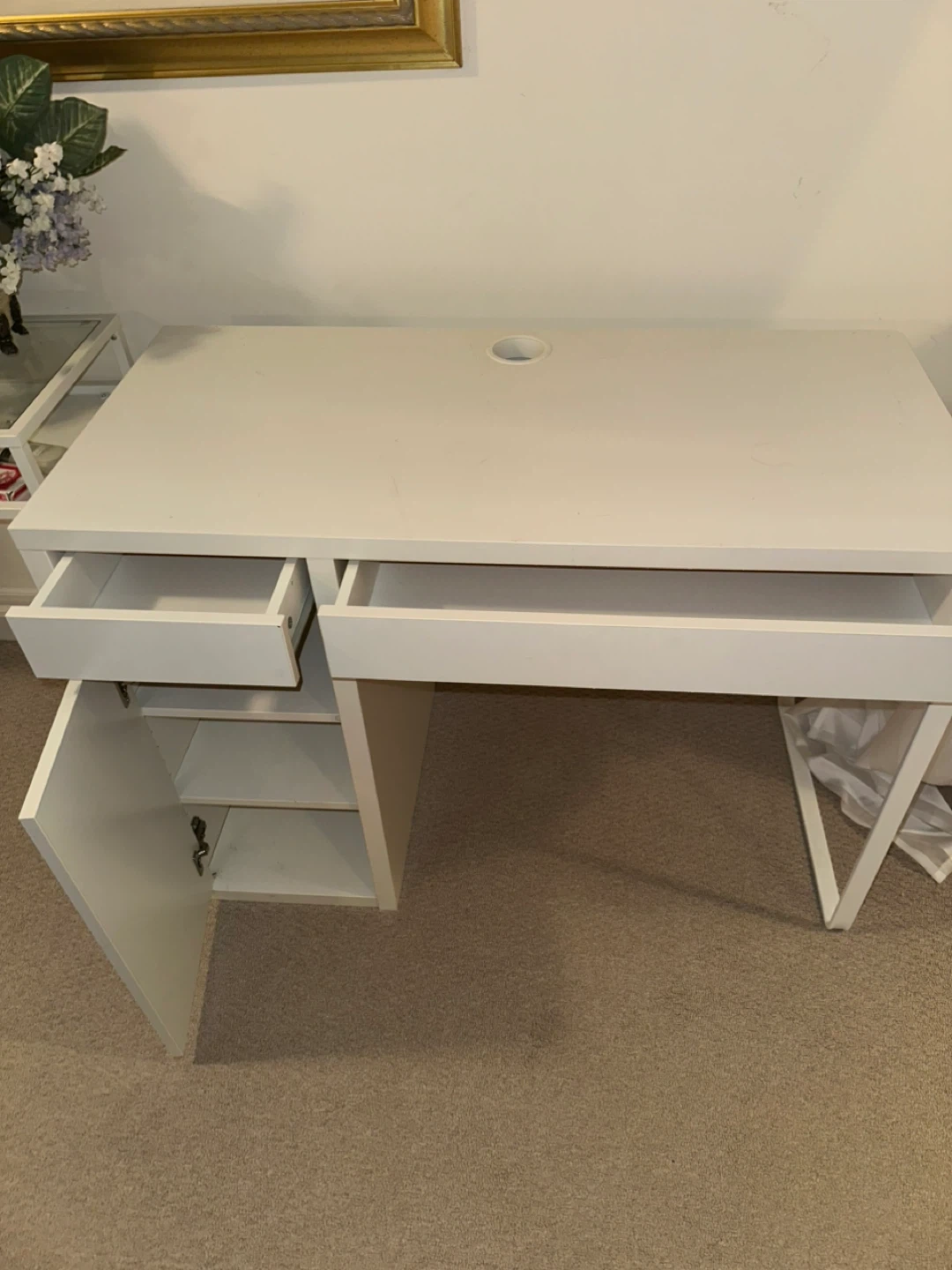 Selling a clean white desk! It features a sleek design with built-in storage, perfect for a home office or study space. The desk has drawers and a cabinet for keeping things organized. It's in great shape and ready for a new home