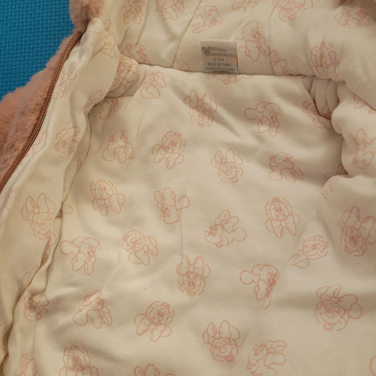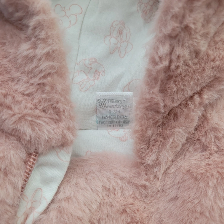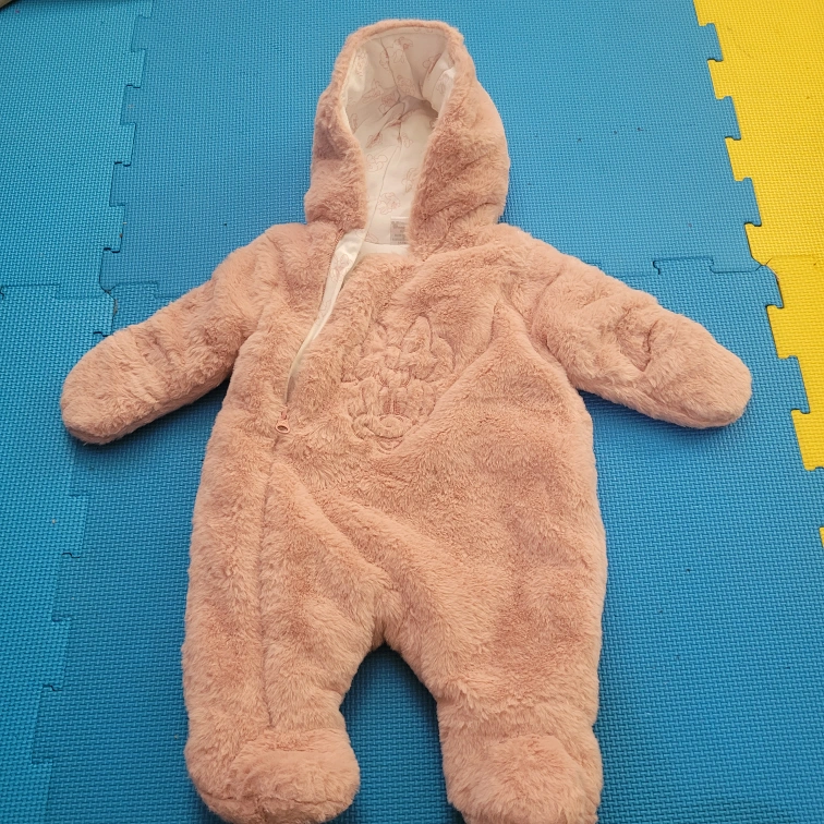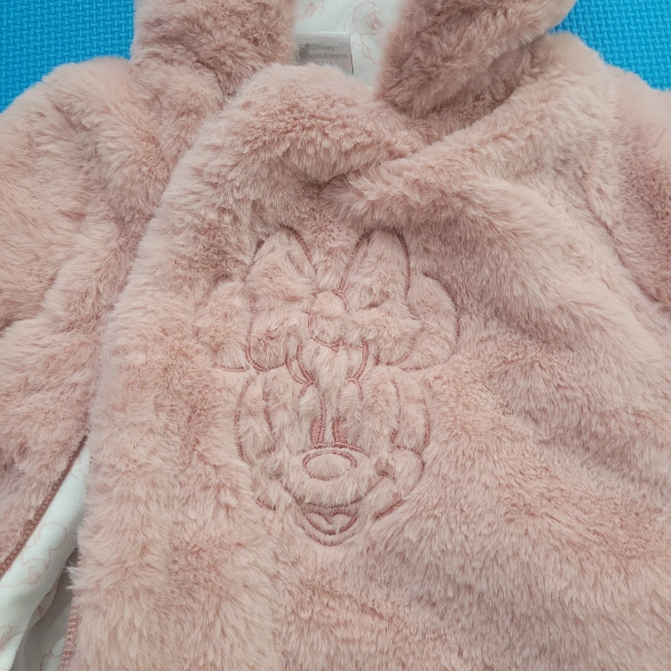 Super cute Disney baby snowsuit in a soft pink faux fur! It has a hood and a zipper down the front. Perfect for keeping your little one warm and cozy during the colder months