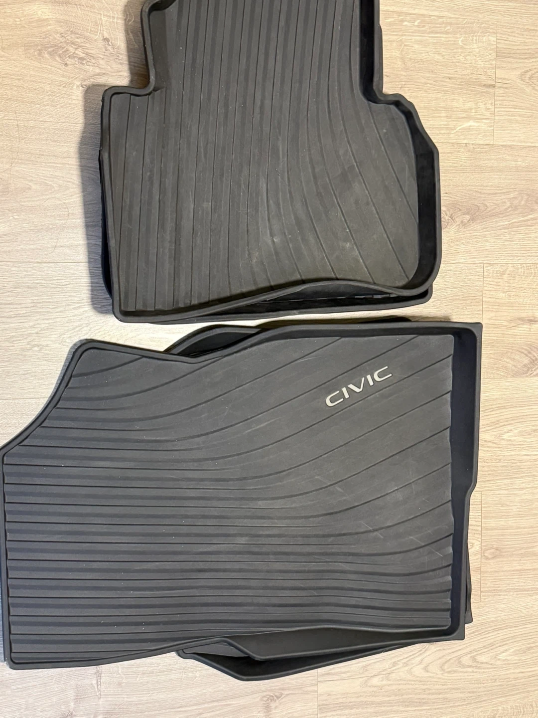 Selling a set of black floor mats for a Honda Civic. They are in great condition and will keep your car clean and protected!