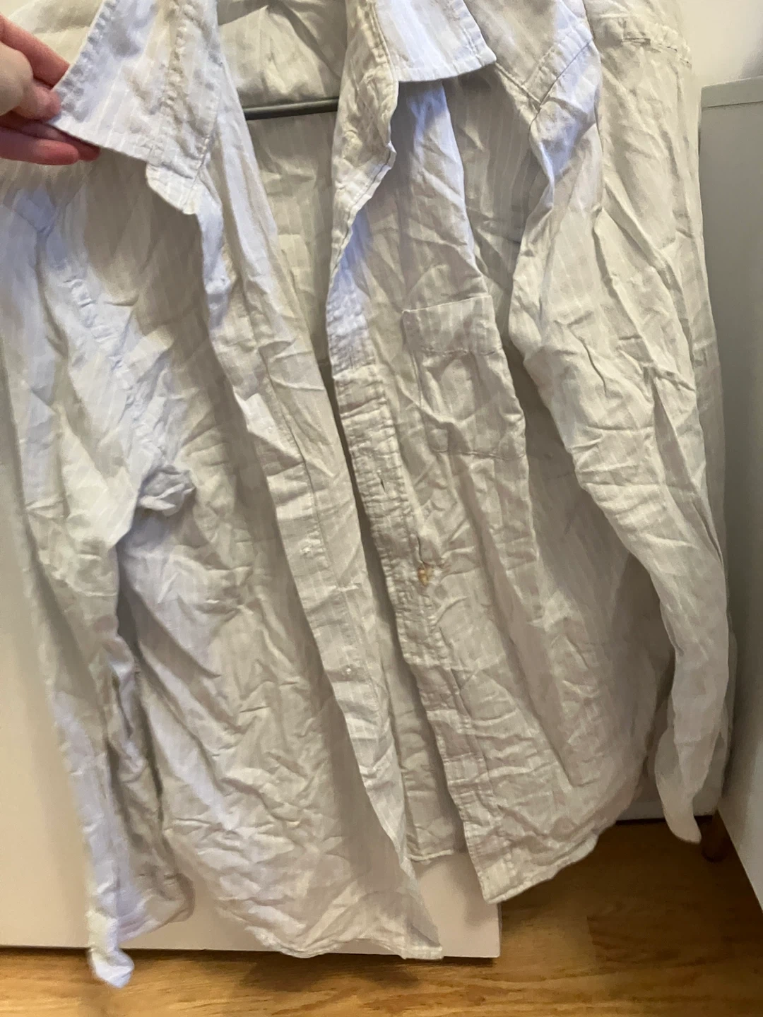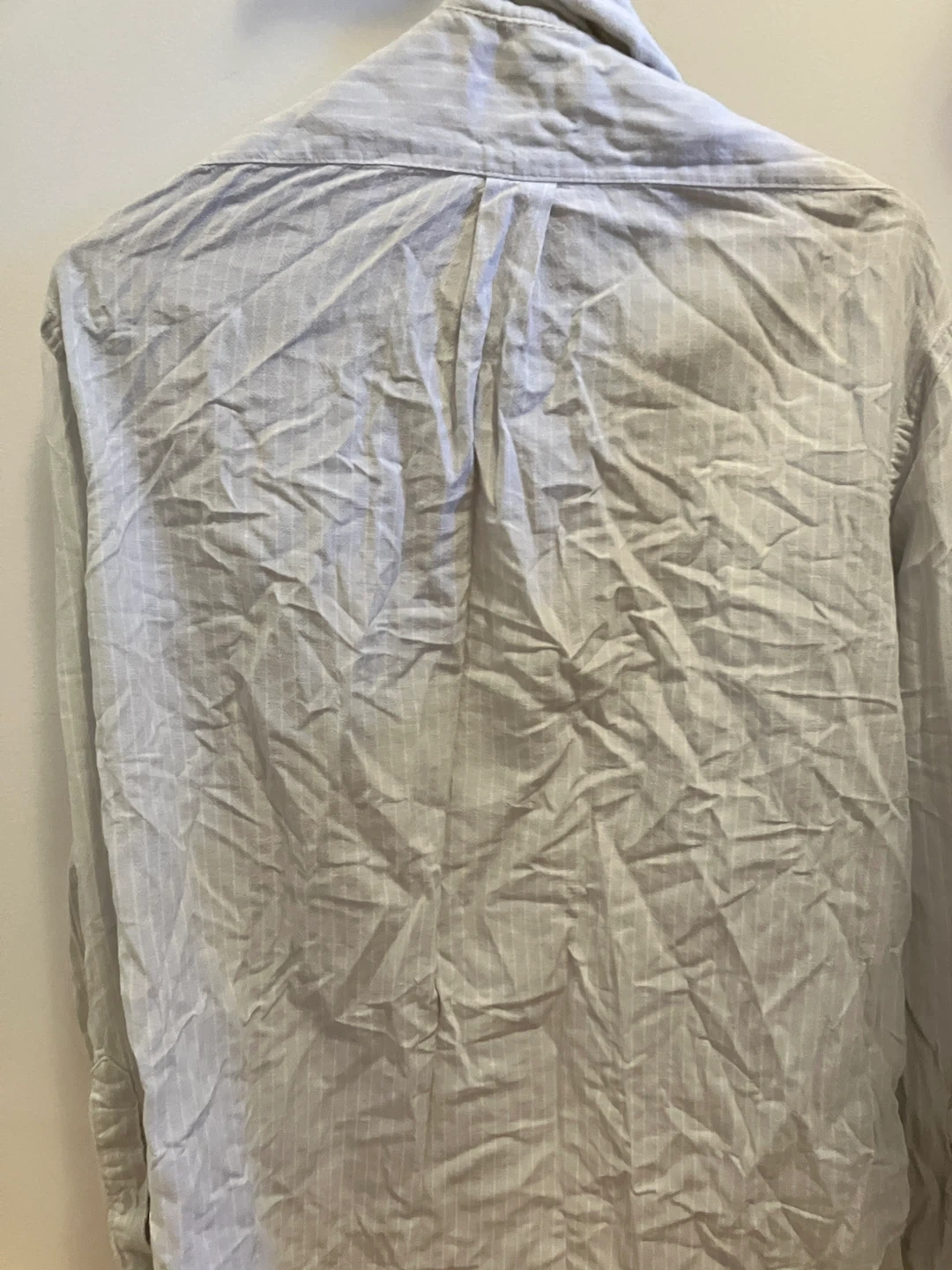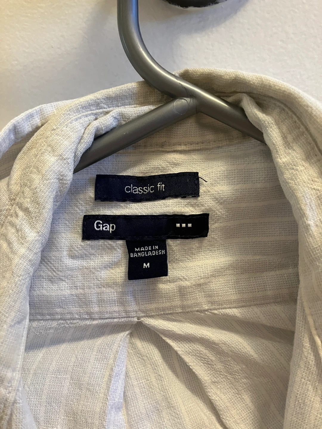 Selling a Gap classic fit shirt in size medium. In good condition and just needs an ironing! It's a very light blue/white colour with subtle stripes, and made of 75% cotton and 25% linen. Perfect for a casual look! Thrifted this and wanted it to fit for an oversized look but sadly too big (I fit an xs)