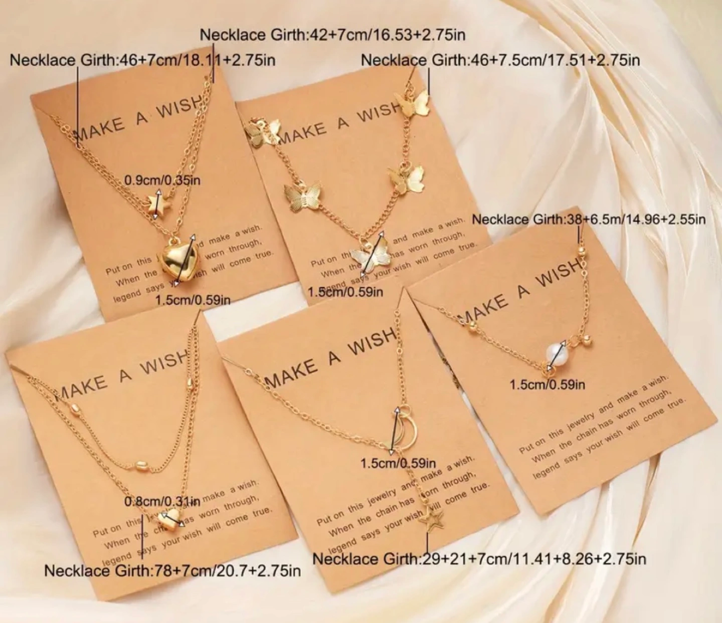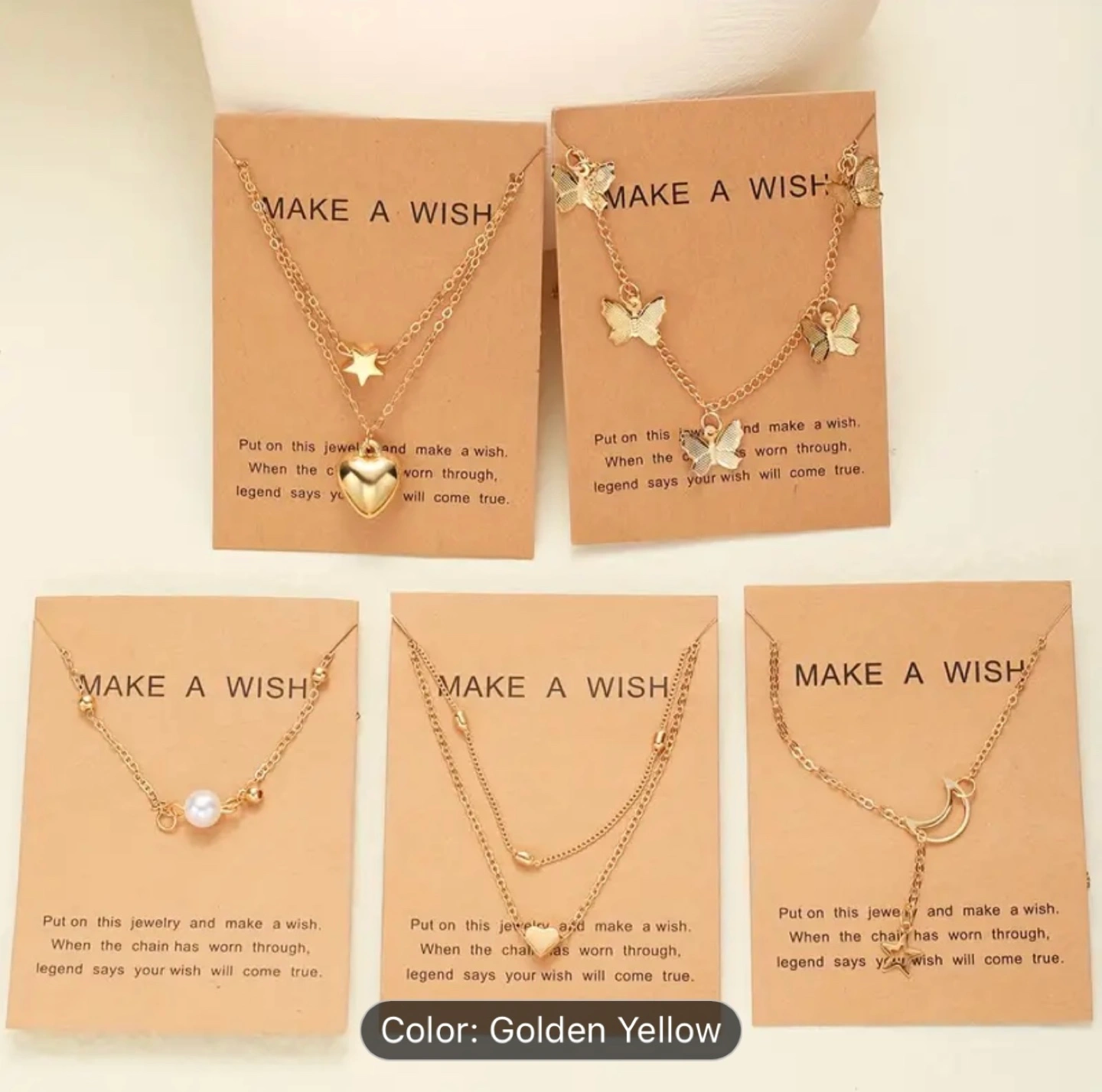 Add a touch of charm to your style with this adorable Make a Wish necklace set! The necklaces are a lovely golden yellow colour and come in various designs, perfect for mixing and matching. Each necklace is designed to bring a bit of magic to your day! The necklace girths vary between 29+21+7cm and 46+7.5cm