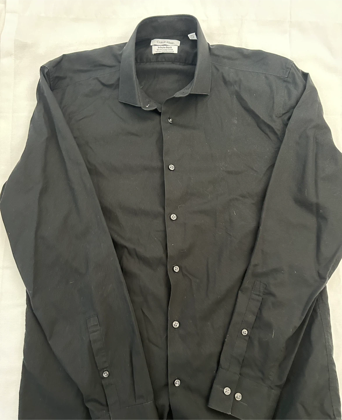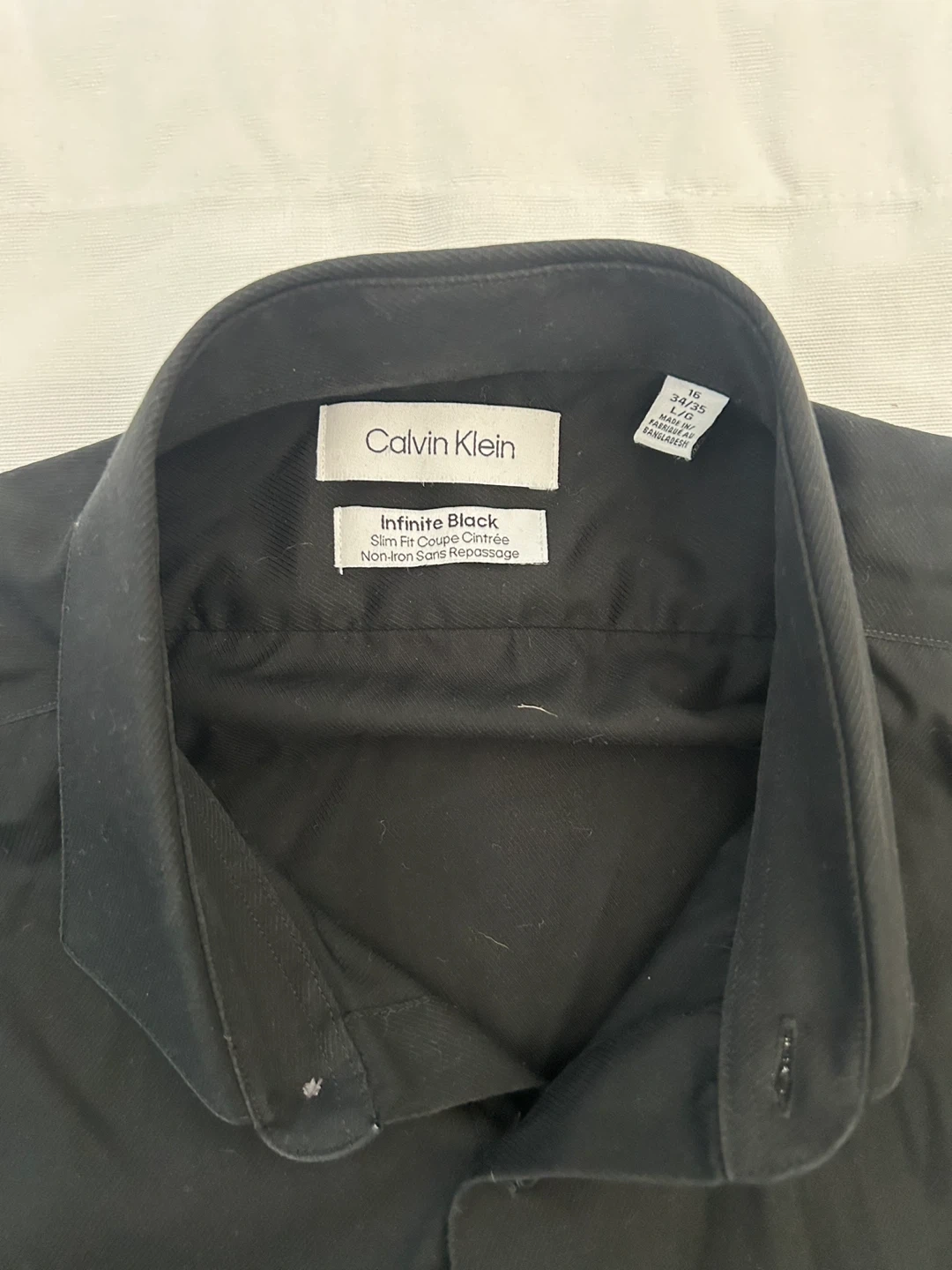 Selling a Calvin Klein Infinite Black dress shirt in size 16 or 34/35. It's a slim fit and non-iron, making it super easy to care for. A classic addition to any wardrobe!