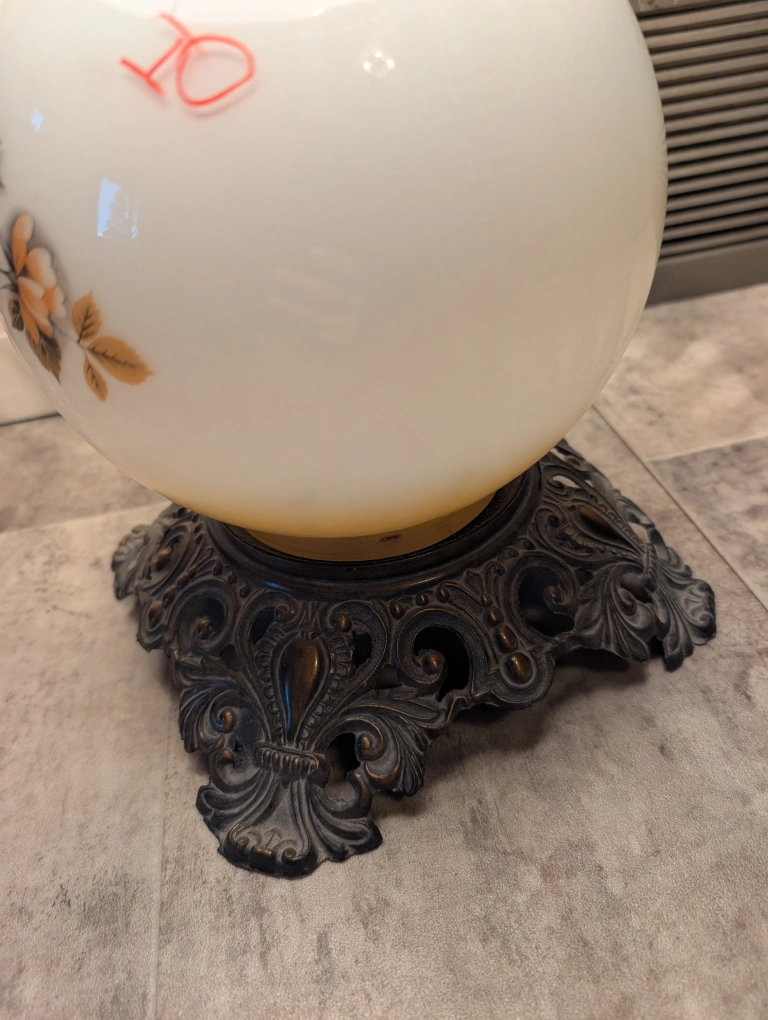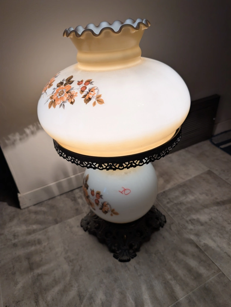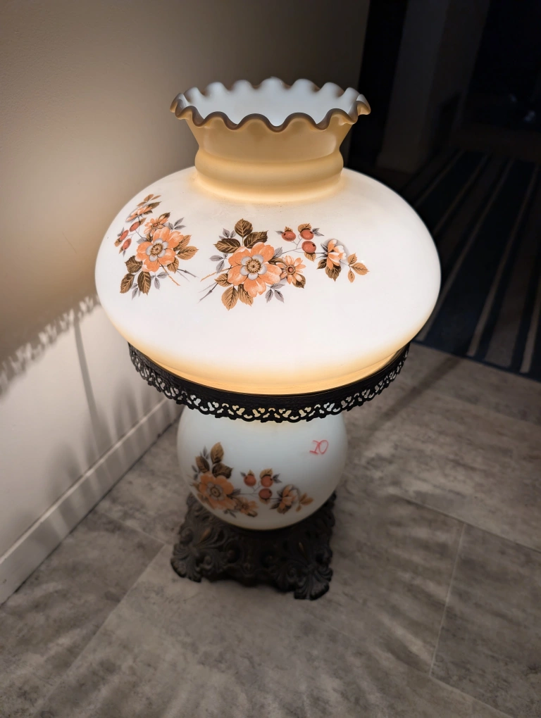 Selling a vintage accent lamp with a lovely floral design! It features a white glass shade adorned with orange and brown floral patterns. The base has an ornate, antique-style metal design. It's perfect for adding a touch of vintage charm to any room 165$ or best offer price negotiable