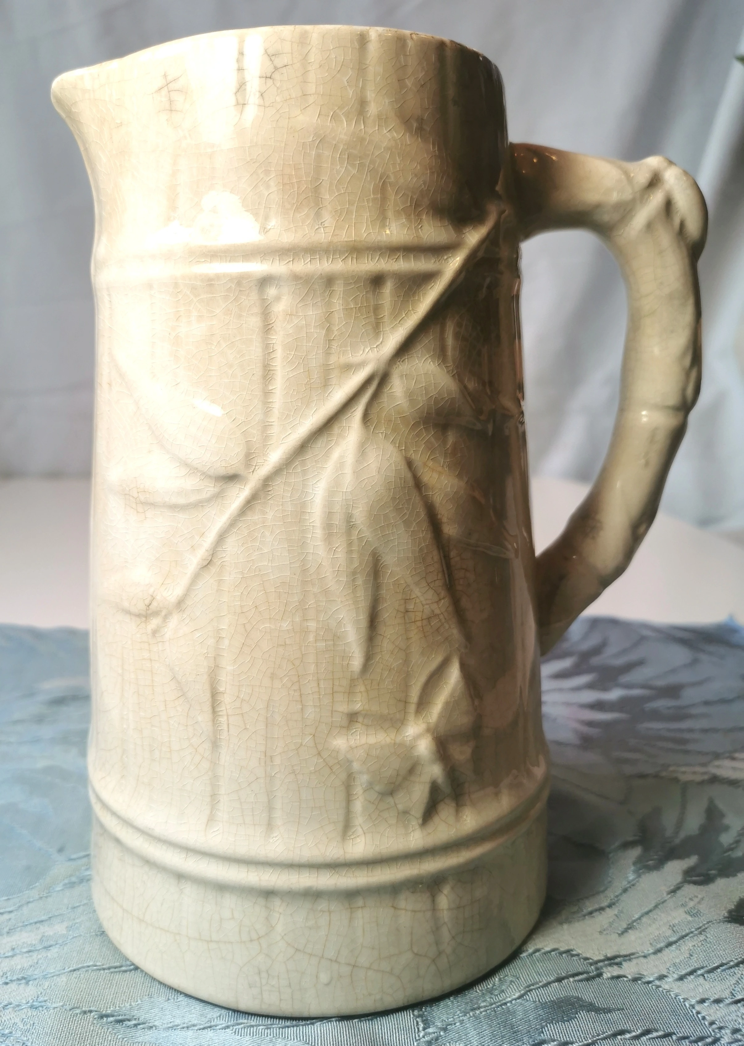 This Victorian pitcher is a charming piece with a unique bamboo design and stained kitchen jug from the early 1900s. Featuring a nature print pattern and made from ceramic, this medium-sized jug has a coffee color finish and measures 8 inches in height with a diameter of 4.75 inches. The Victorian style and vintage appeal make it a perfect addition to any kitchen or home decor, suitable for all occasions and adding a touch of antique elegance to your space. Hand wash only to preserve its natural beauty. NOTE: Good Antique Condition some crazing light wear commensurate with age, please reference photos as part of the description