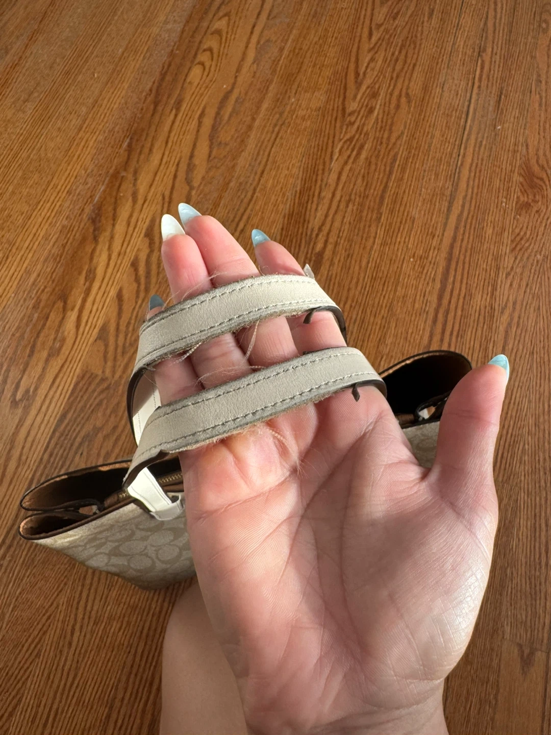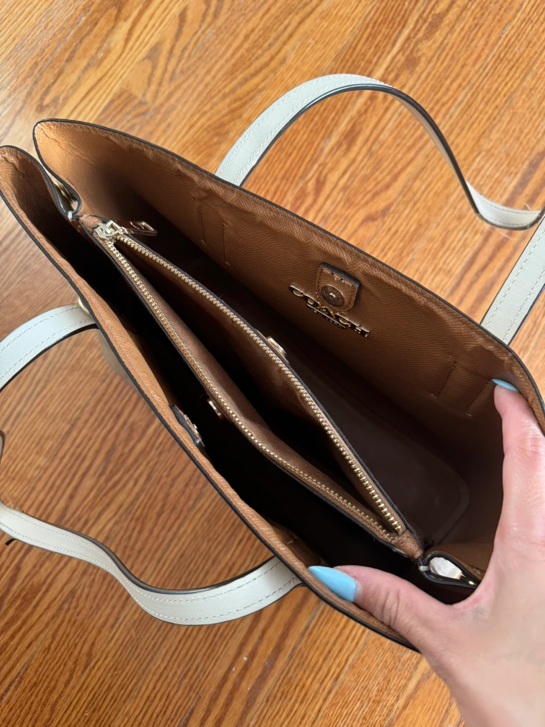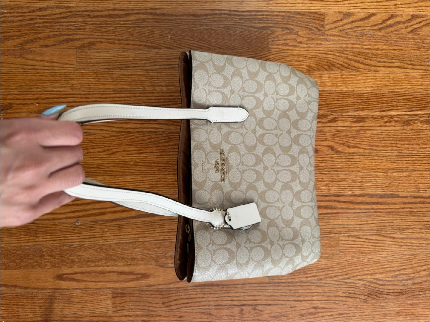 10Selling a cute Coach tote bag! It has the signature jacquard pattern and white straps. The inside has a zipper pocket for extra storage. The straps are showing some wear, as pictured.