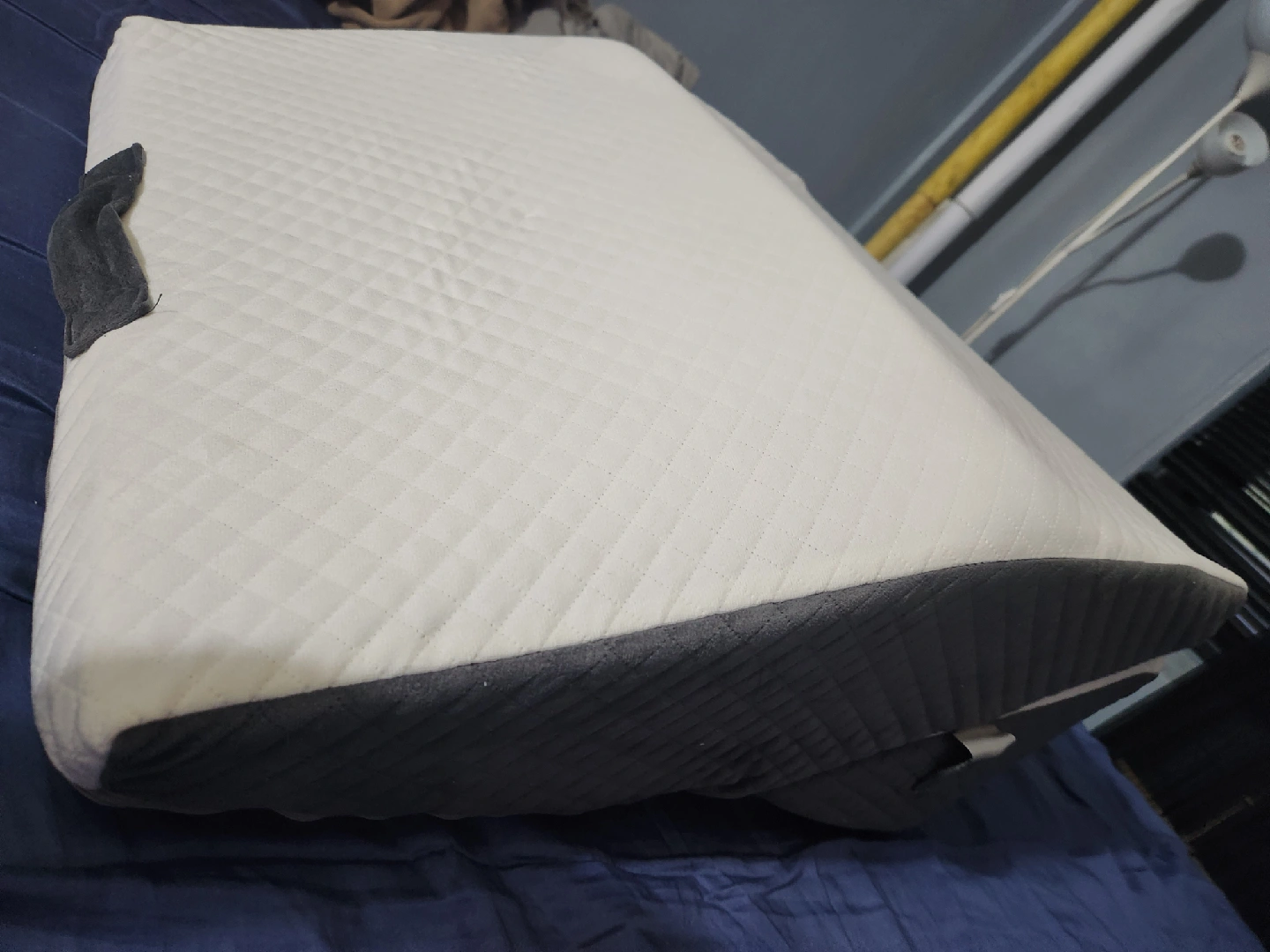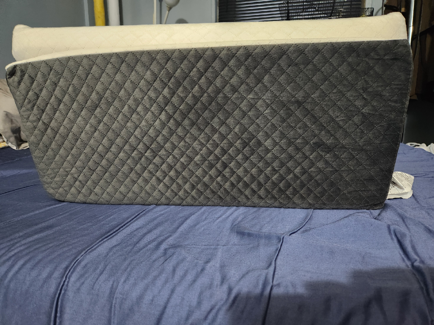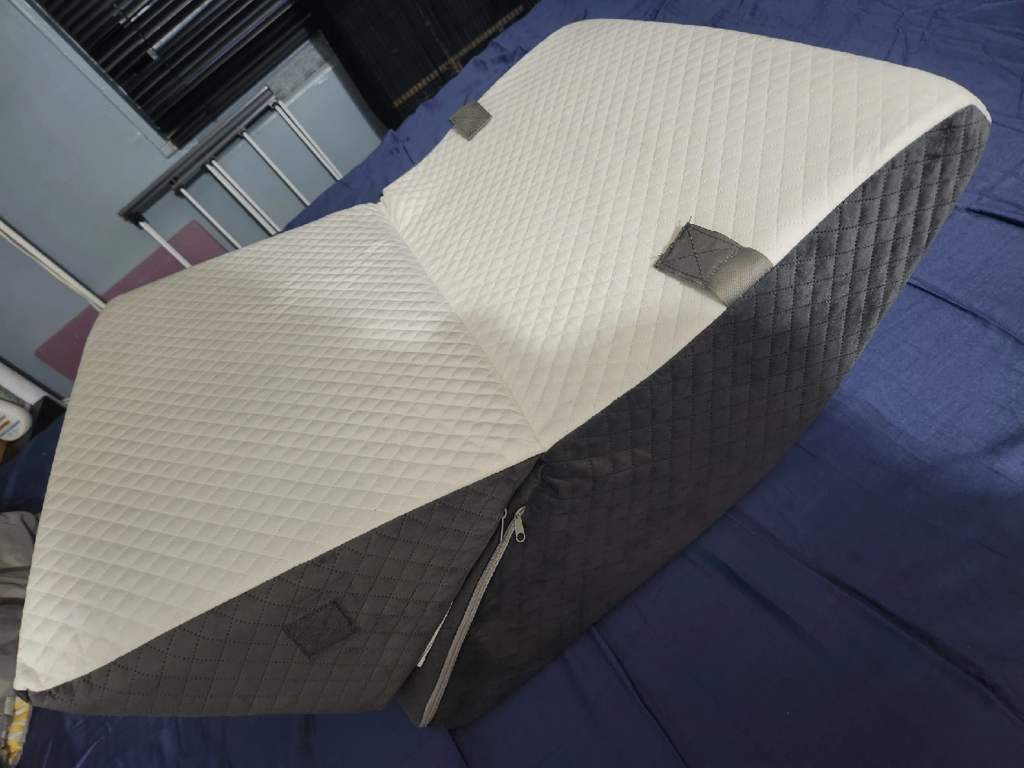 I'm selling an adjustable bed wedge pillow in a stylish gray and white color scheme. This can help with acid reflux, sleeping position, etc. The covers are removable and machine washable.