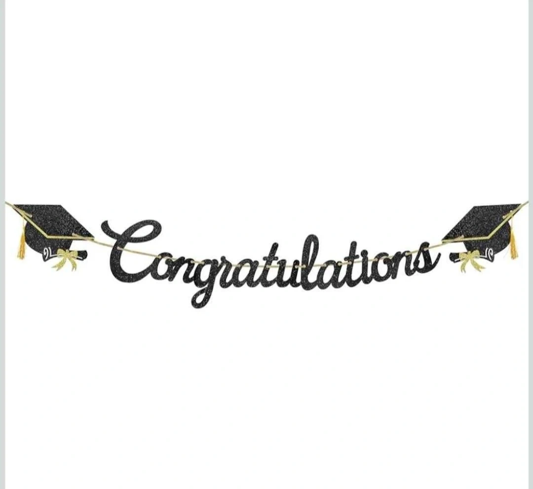 Selling a brand new graduation decoration set! It includes a 'Congratulations' banner, 9 swirl graduation-themed cutouts, and 6 tissue paper pom poms in black and gold. Perfect for celebrating a graduation!