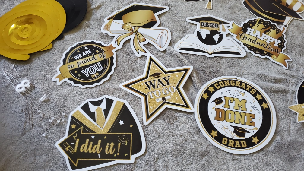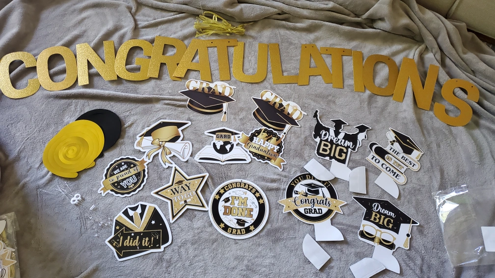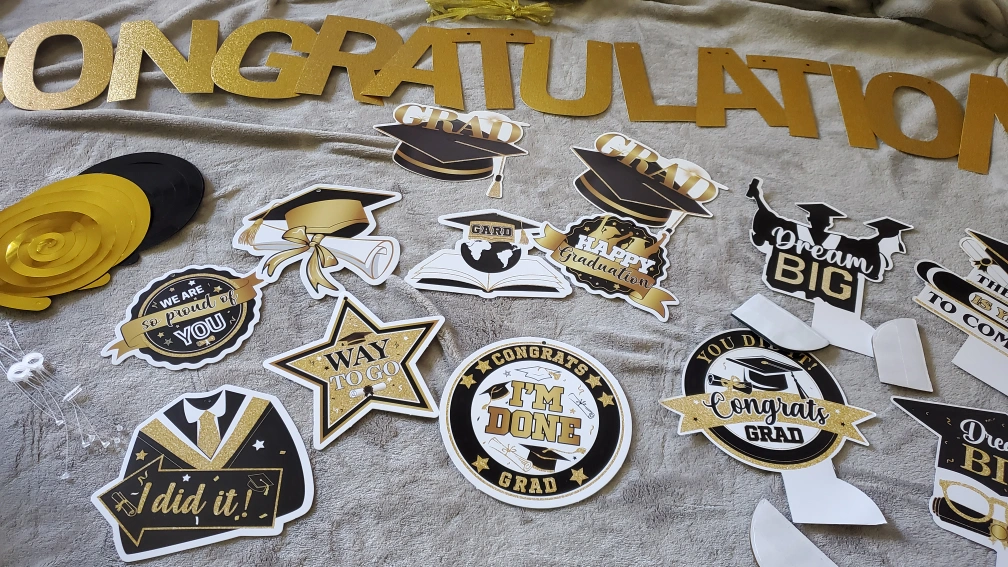 Selling a set of graduation party decorations in gold and black. Includes a 'Congratulations' banner, 7 swirl graduation-themed cutouts, and 4 centrepiece decorations. Perfect for a graduation celebration!