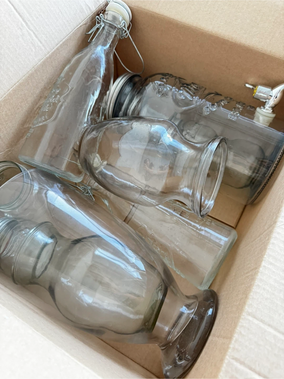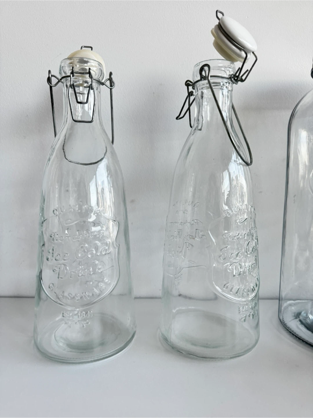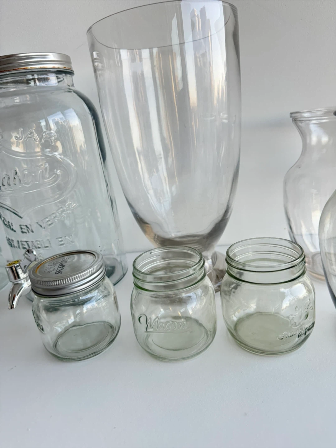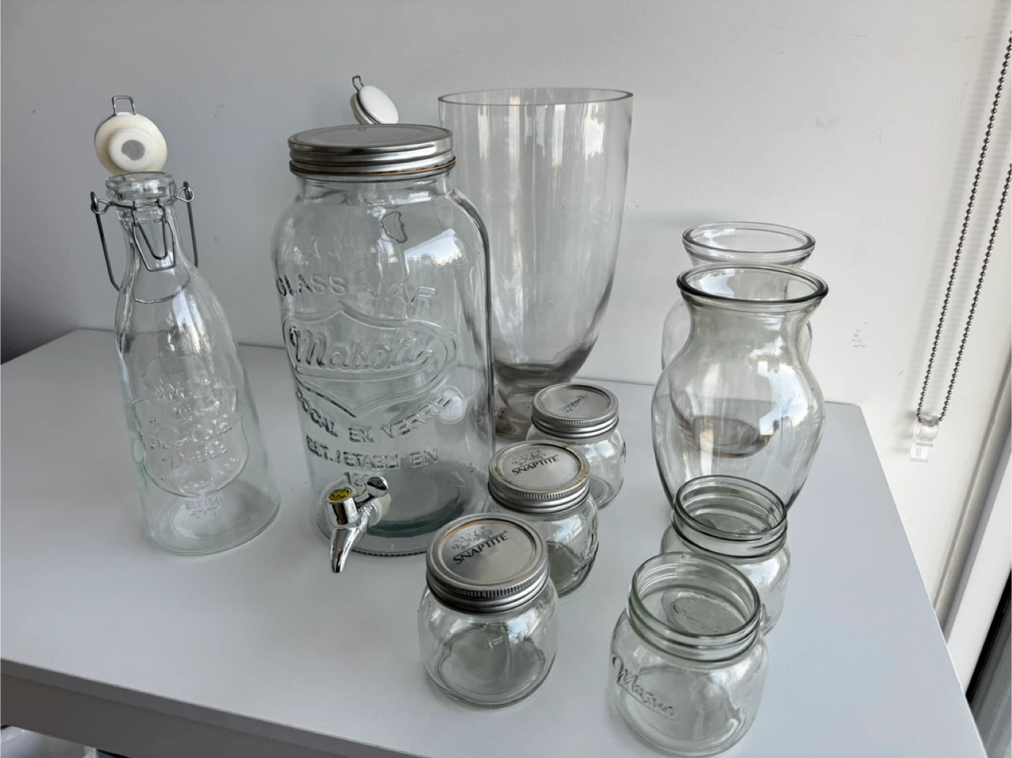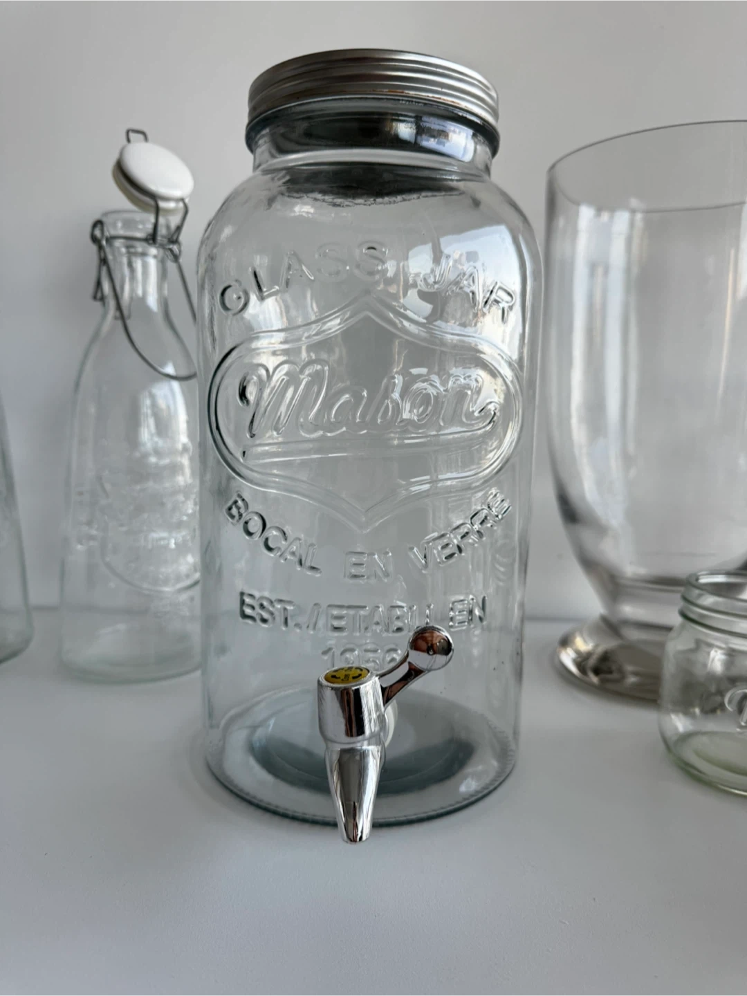 Selling a collection of glass bottles and a mason jar drink dispenser. The bottles include swing-top styles and various sizes. Also included is a large mason jar with a spigot, perfect for serving drinks at gatherings. All items are in good condition and ready for a new home!