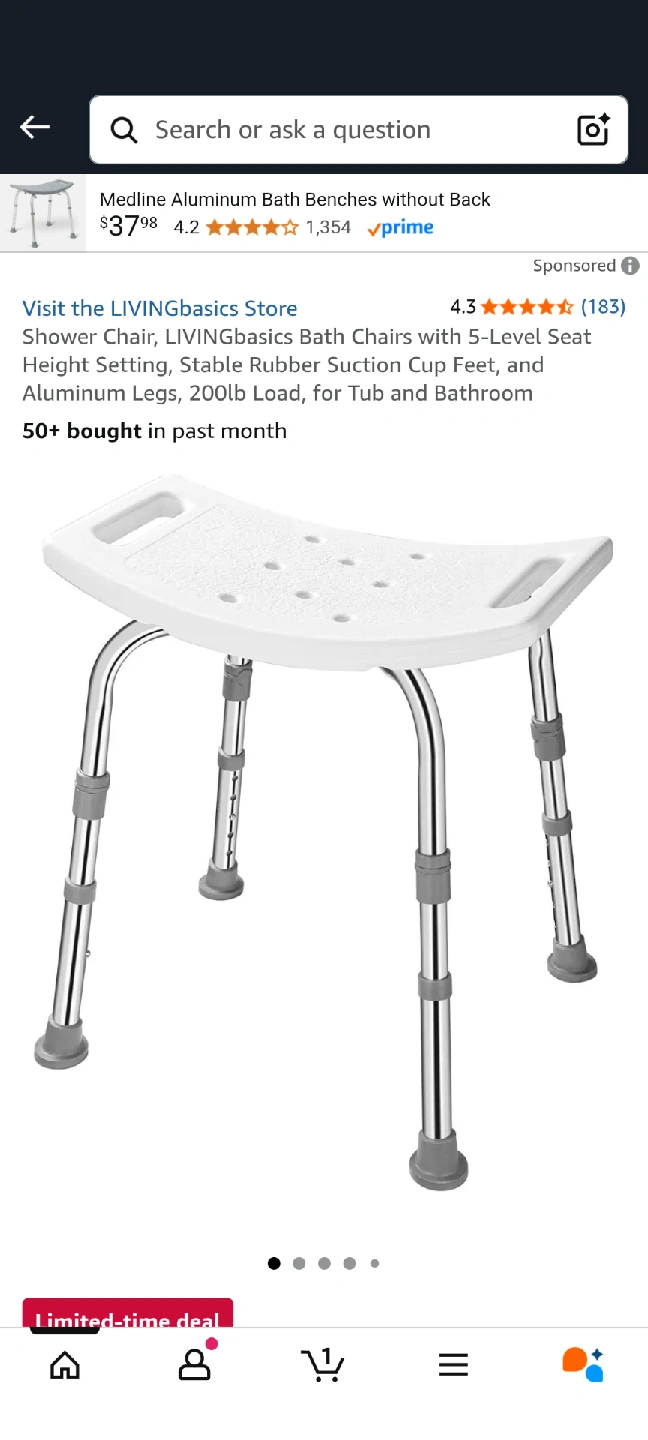 Selling a LIVINGbasics shower chair! It features a 5-level seat height setting and stable rubber suction cup feet. The legs are aluminum and can hold up to 200lbs. Perfect for the tub or bathroom. Originally bought for $37.98
