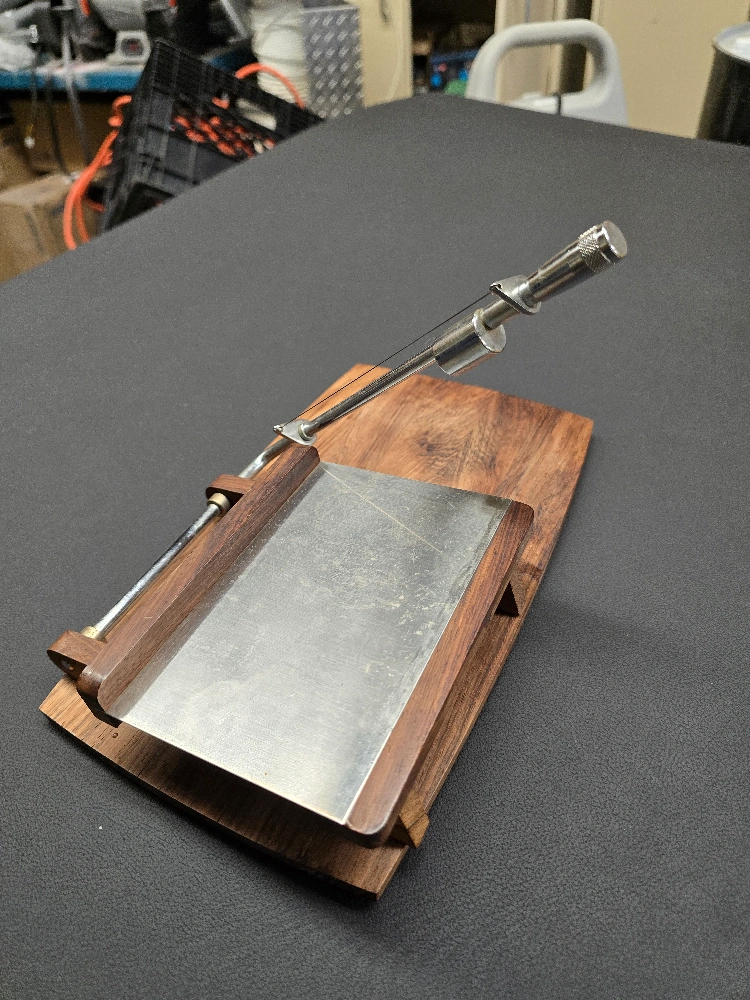 Here's a vintage mandoline slicer with a beautiful oakwood and stainless steel construction. It's perfect for slicing cheese and more with precision. A great addition to any kitchen!