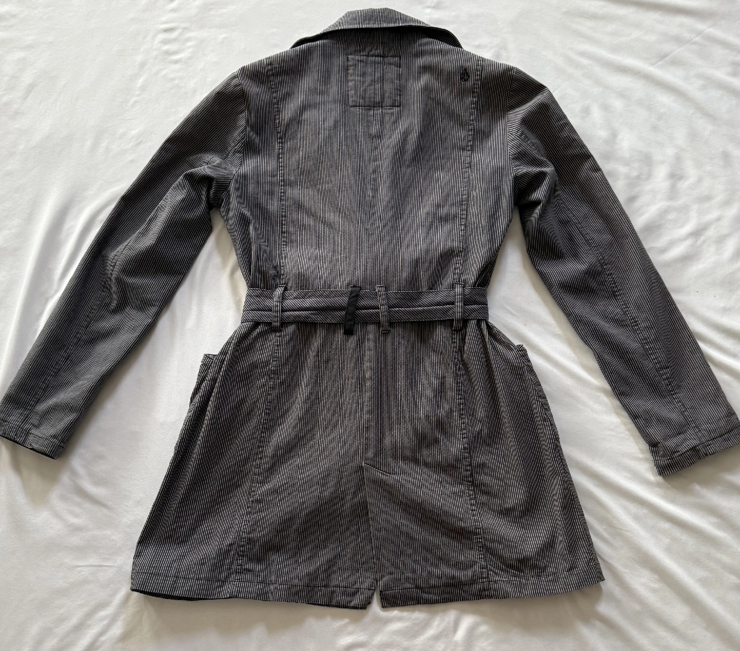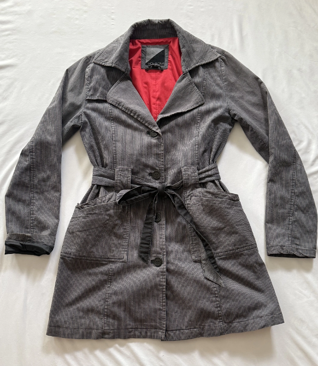 A stylish Volcom trench coat in a unique striped corduroy material! This coat features a red lining, a tie belt, and front pockets. It's a size medium and in great condition, ready to add a touch of flair to your wardrobe
