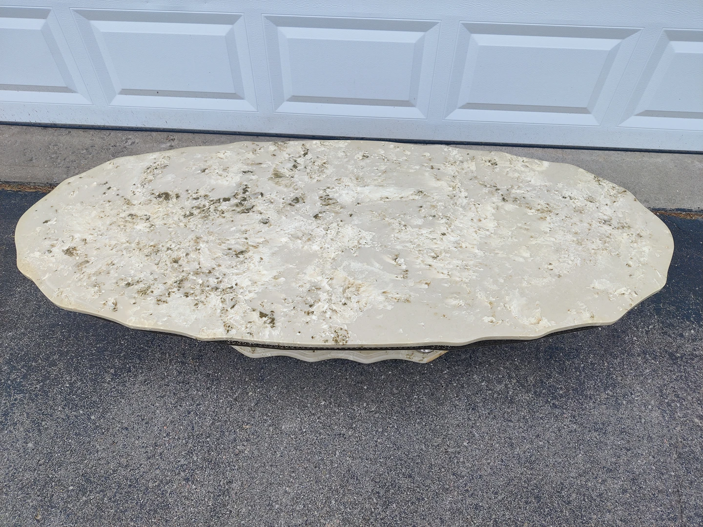The columns have a tarnished silver look. Rust on part of the lace accent going around the tabletop as pictures show.