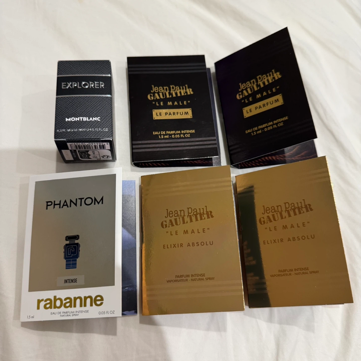 237Selling a set of addictive scents: - Montblanc Explorer (4.5ml) - JPG Le Male Le Parfum (1.5ml x 2) - JPG Le Male Elixir Absolu (1.5ml x 2) - Rabanne Phantom Intense (1.5ml) Condition: New