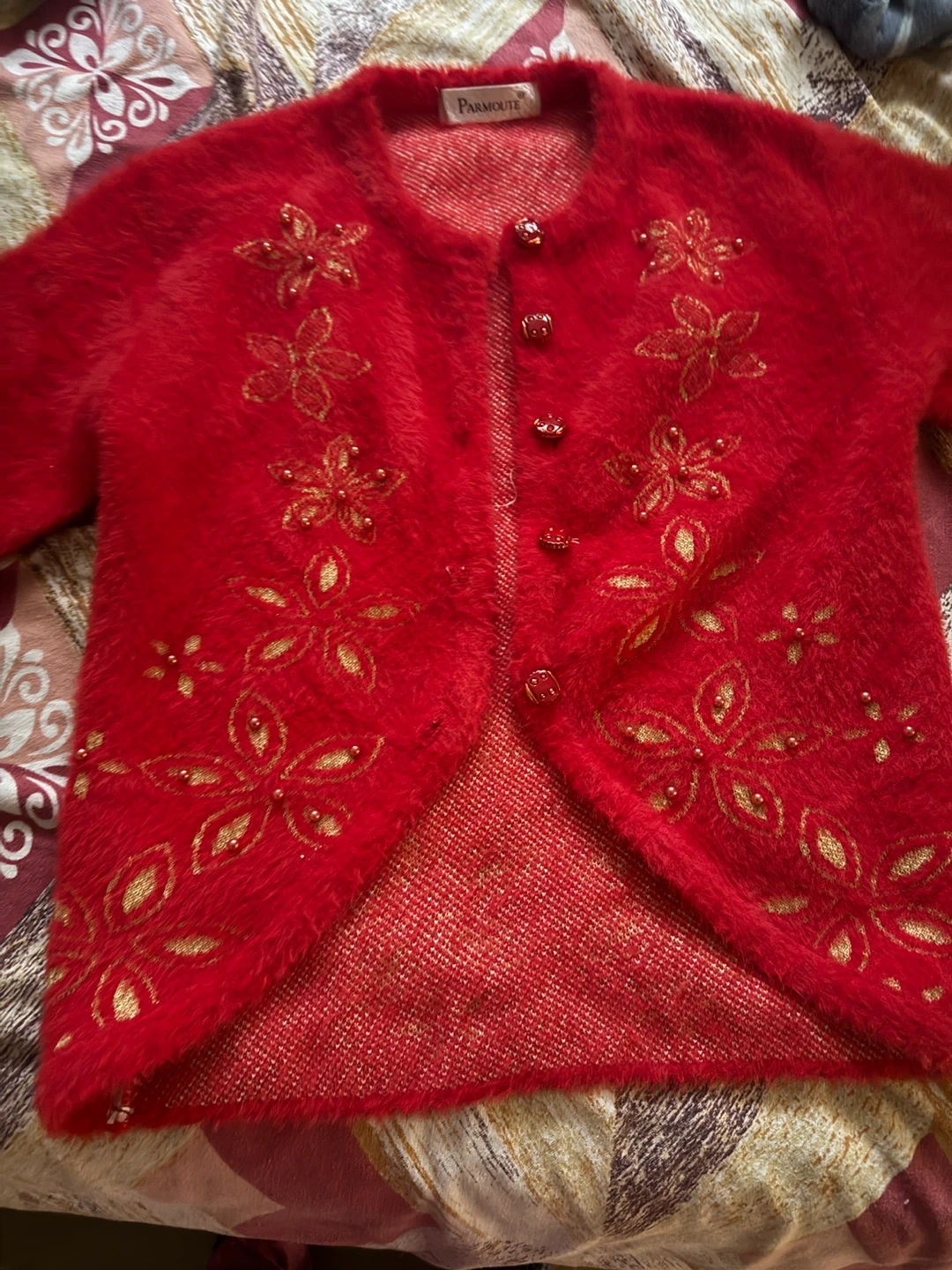 Here's a lovely red cardigan from Parmount! It's a fuzzy, soft material with delicate gold flower detailing. Perfect for wearing on suit.