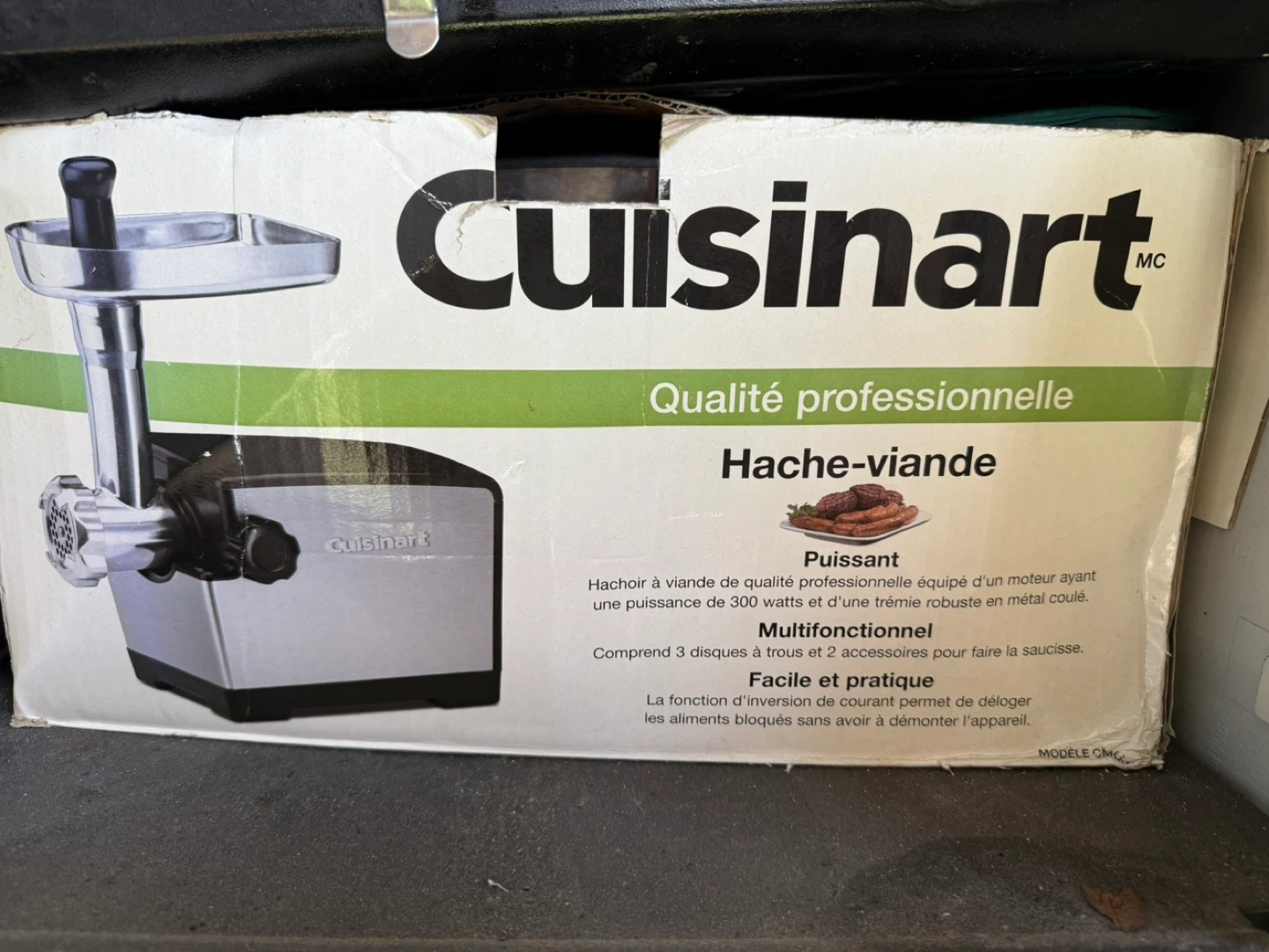 Selling a Cuisinart meat grinder. It's a professional quality meat grinder equipped with a 300 watt motor and a sturdy cast metal hopper. It includes 3 hole discs and 2 accessories for making sausage. The reverse current function dislodges blocked food without disassembling the appliance