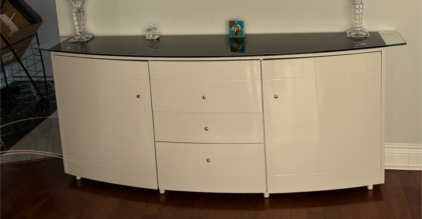 Selling a stylish white curved cabinet, perfect for adding a touch of elegance to any room! It features a sleek glass top and offers ample storage space with both doors and drawers