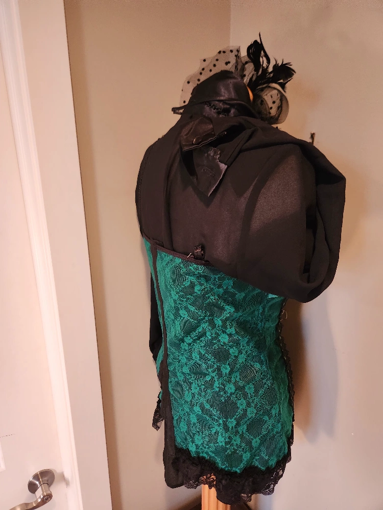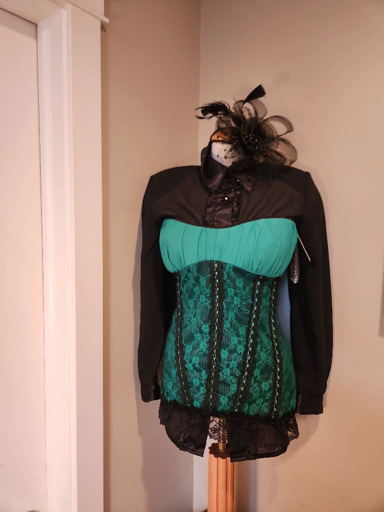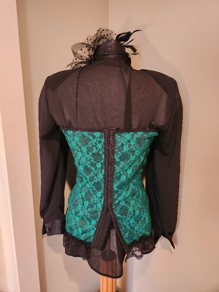This jazzy NEW WITH TAGS SIZE 1X/2X corset makes a great holloween outfit. This unique Kelly green and black corset is great over a frilly lace or sheer blouse