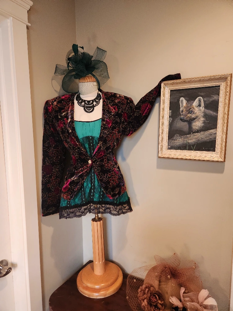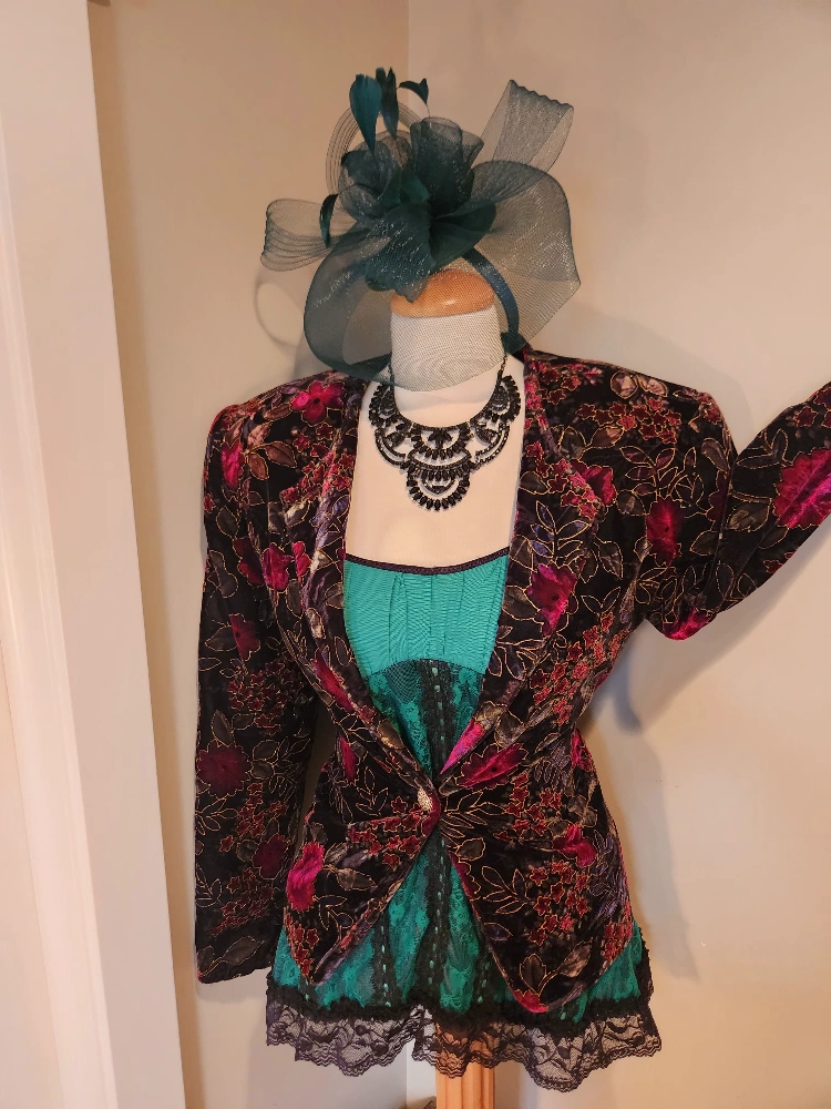 Features a lace bodice with a black trim comes with detachable strapsfor support. It looks teal color in photos. but its actually kelly green and black. A great Gothic inspired look under a velvet blazer. I'm selling those as well! Perfect for a Holloween event. Vampire costume or special occasion! What a lovely vintage-inspired look! A versitile statement piece for All Hollows Eve or any event that requires a sultry Gothic flare. Also suitable for pirates, New Romantic, Goths or Faeries! Vintage Med/ large. FOLLOW FOR other ads, AND MORE VINTAGE VELVET AND Stay tuned for more gothic and dark cottage core clothing finds!