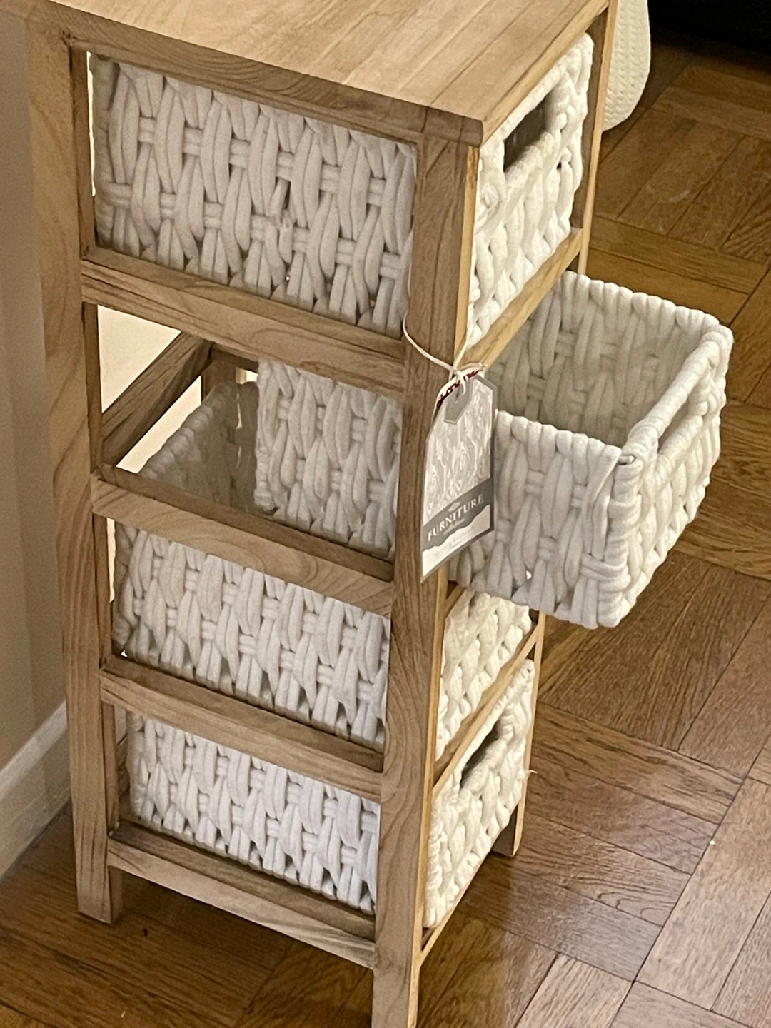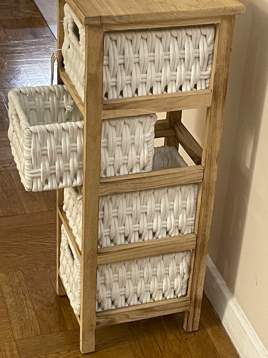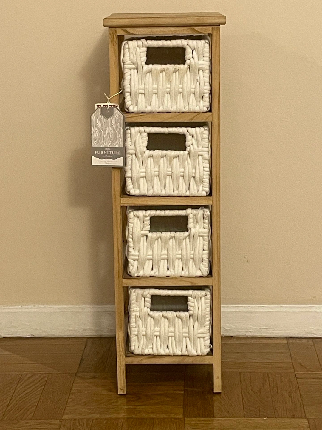 This is a narrow wooden storage unit with four white woven baskets. A compact storage solution suitable for small spaces, like bathrooms, hallways or small areas. Great condition, basket slides easily…with original tag. L-29” x D-11” x W-9”. Pick up only (Manhattan)