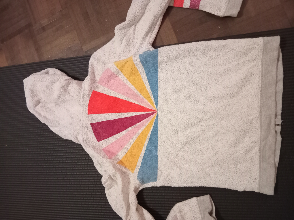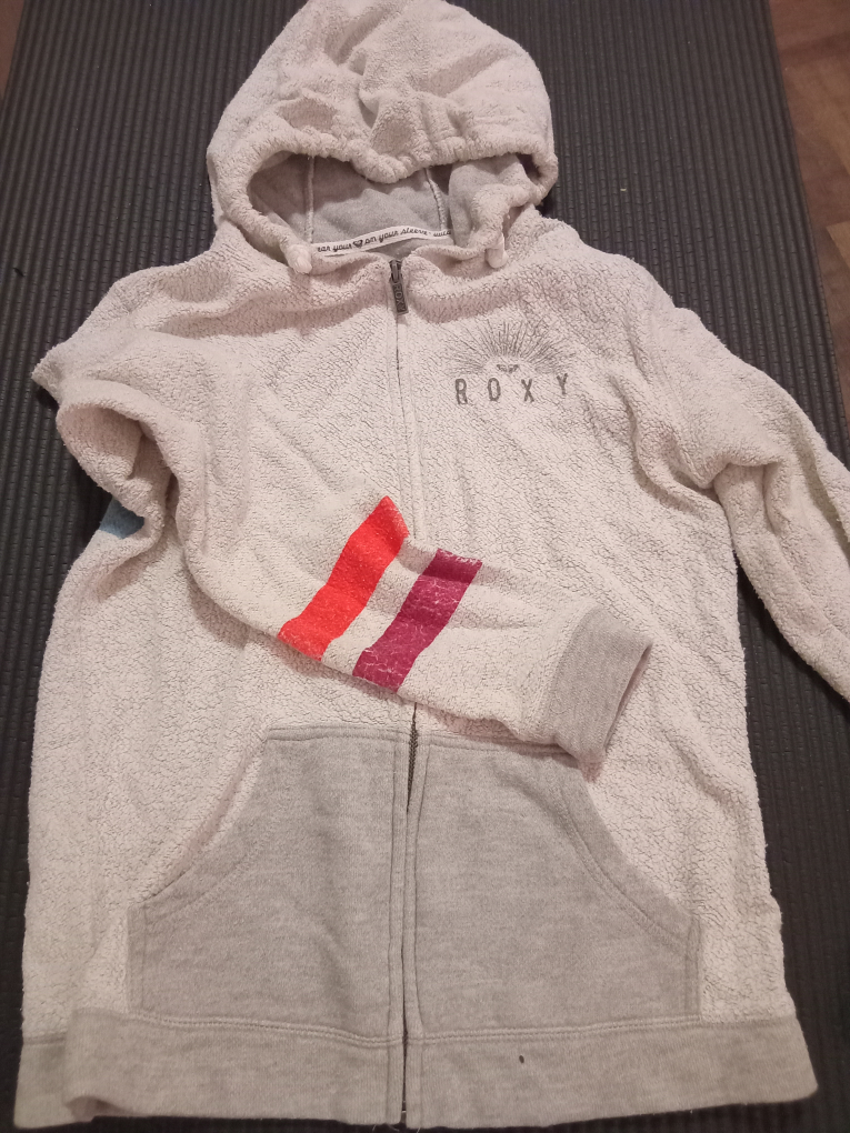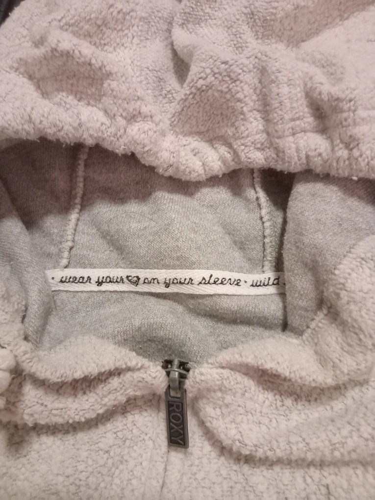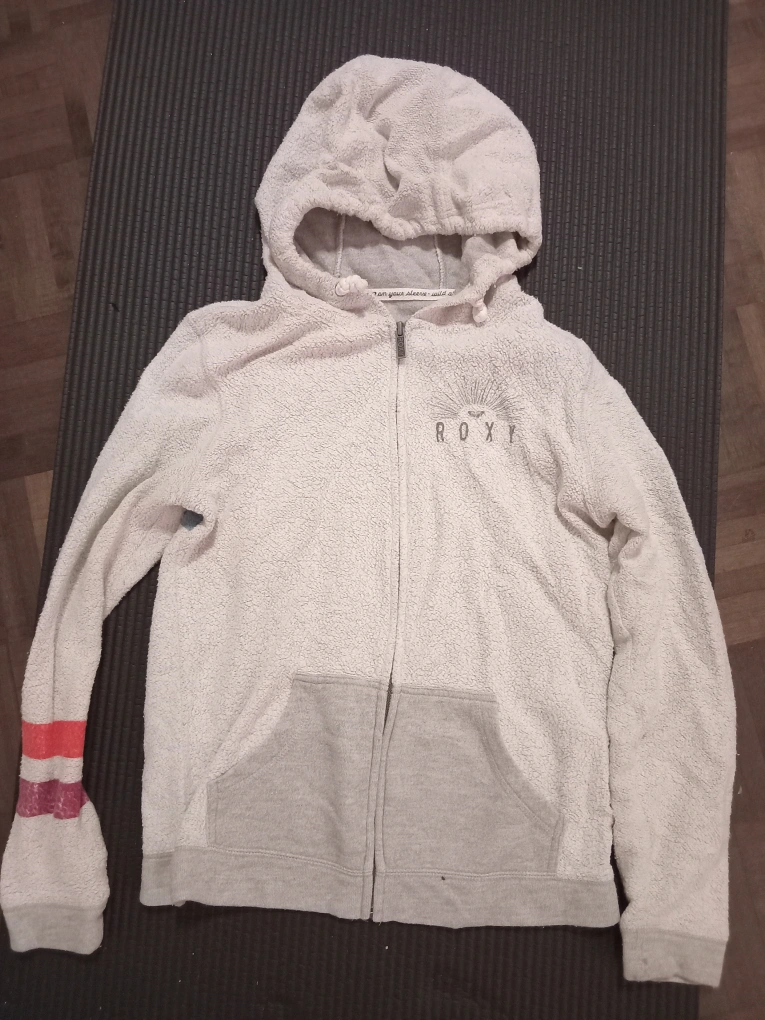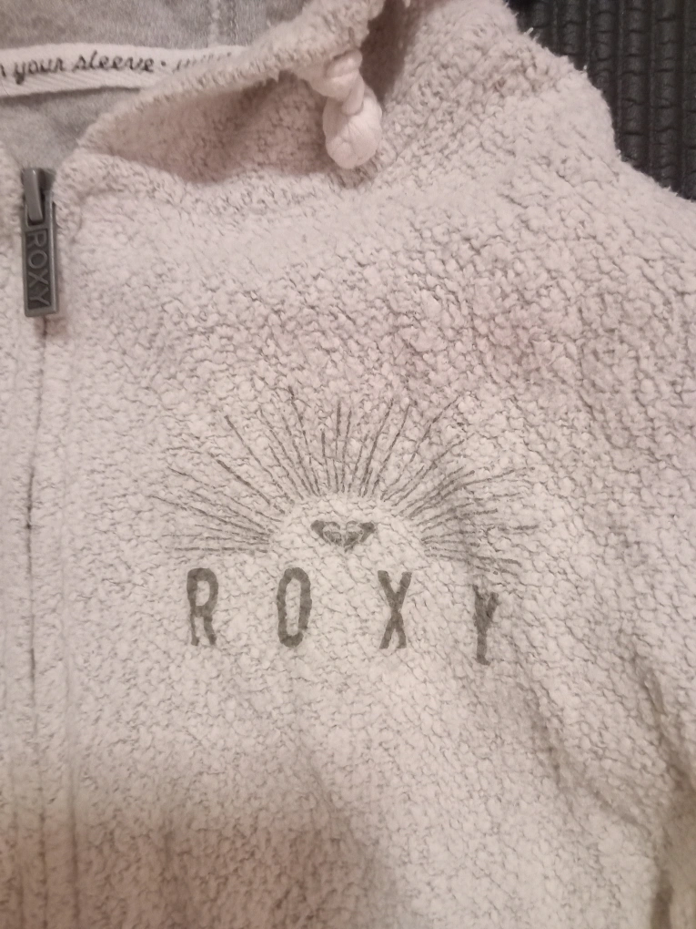 Cozy up with this Roxy fleece zip-up hoodie! It features a hood, a front zipper, and two front pockets. The hoodie is white with grey accents and has a colorful design on the back. Perfect for layering or lounging around the house