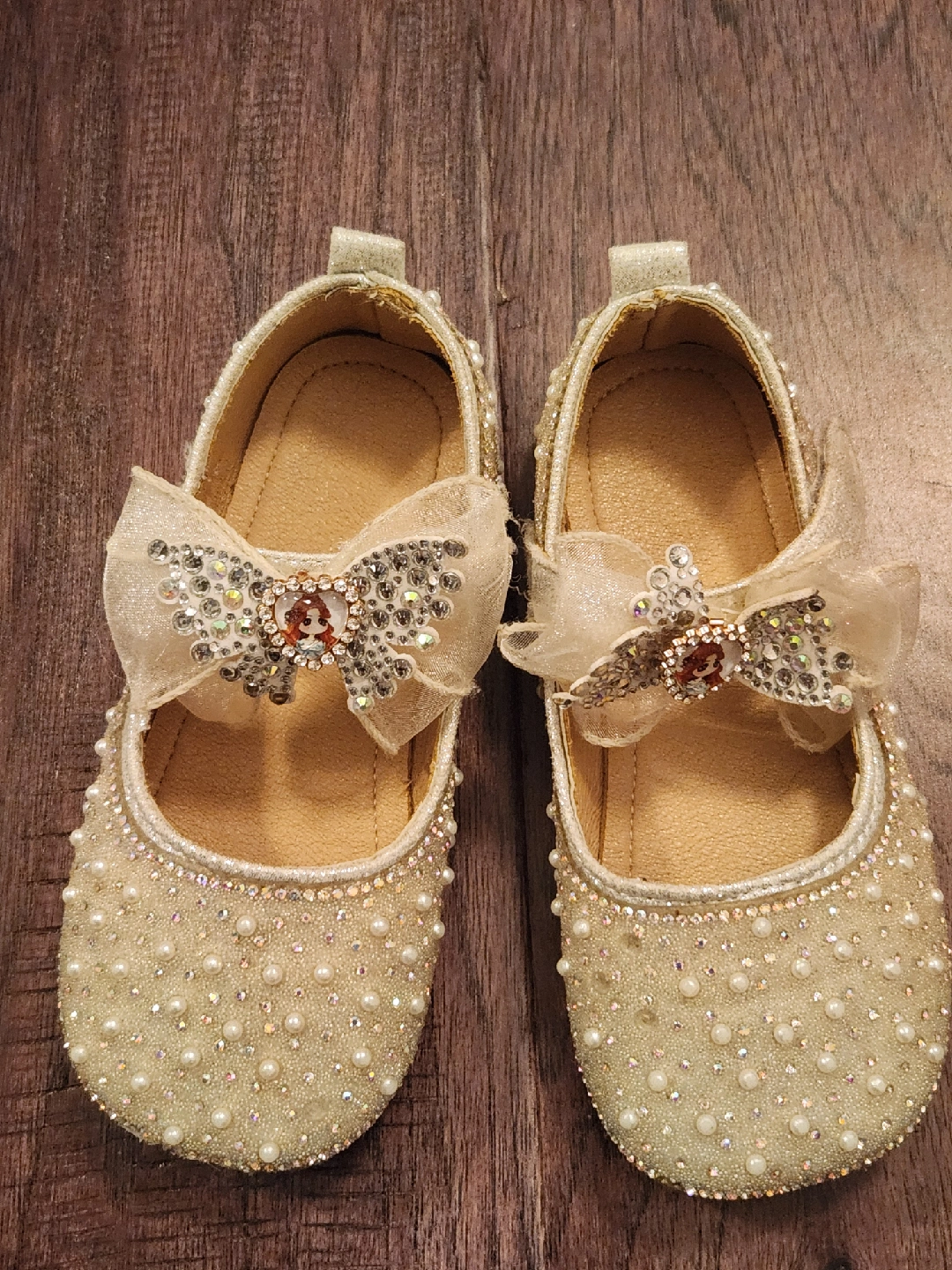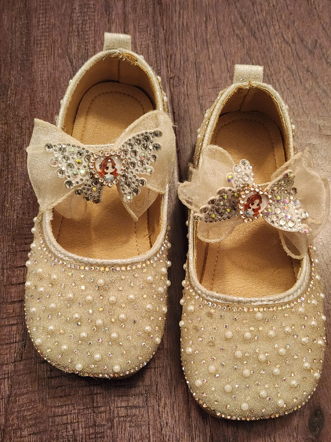 Adorable pair of girls' dress shoes! They're embellished with pearls and rhinestones, and feature a cute bow detail with a character image. Perfect for parties or special occasions