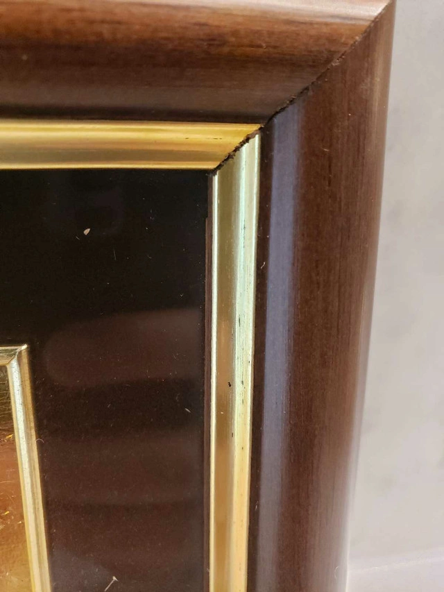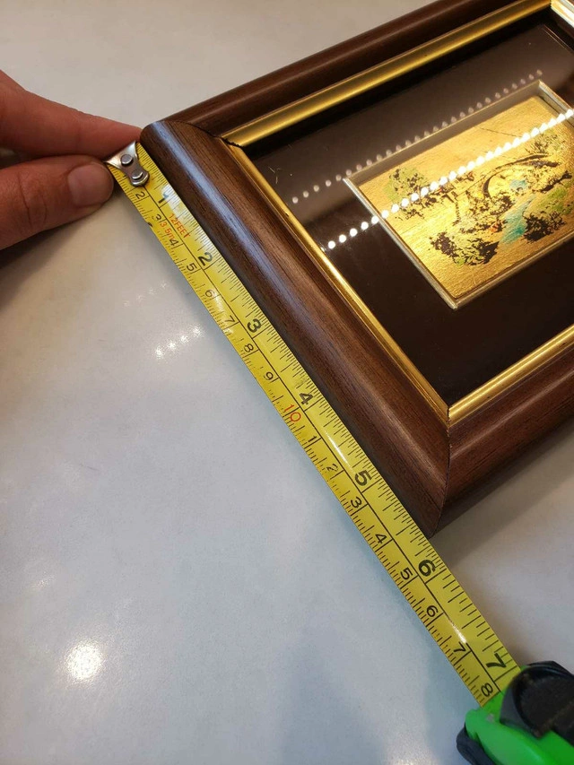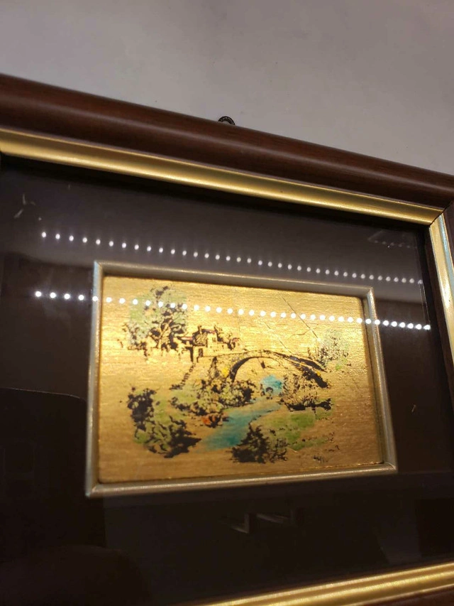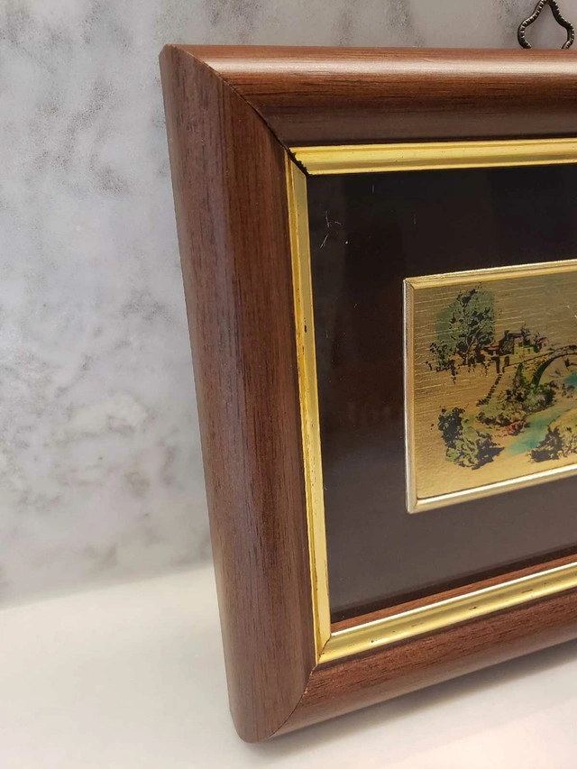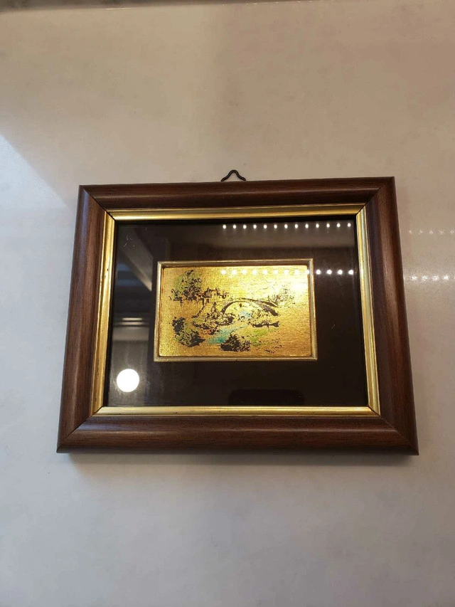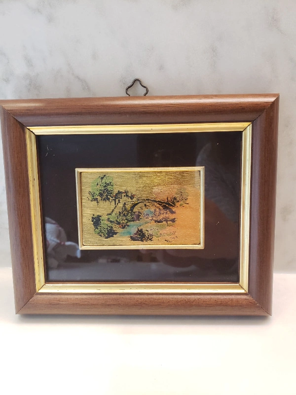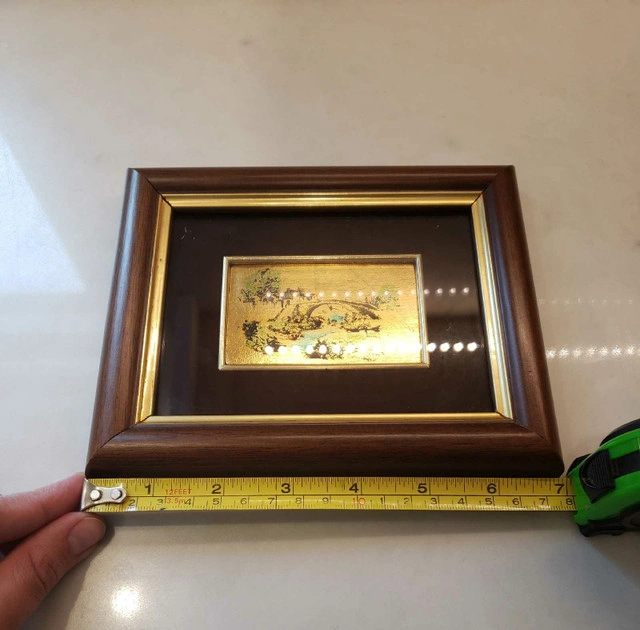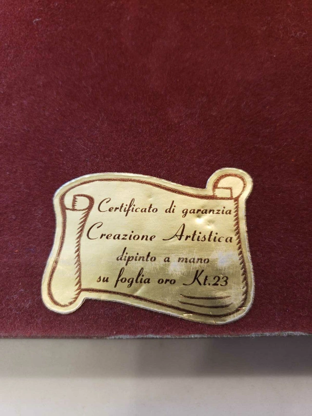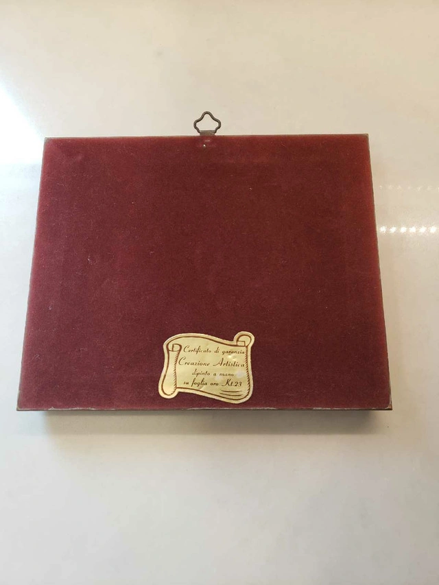 Rough measurements: 7.75 x 6.75 inches. The back says: Certificato di garanzia Creazione Artistica dipinto a mano su foglia oro Tk.23. Translates to: Certificate of Warranty Artistic Creation hand-painted on 23 karat gold leaf. Likely made in Italy.