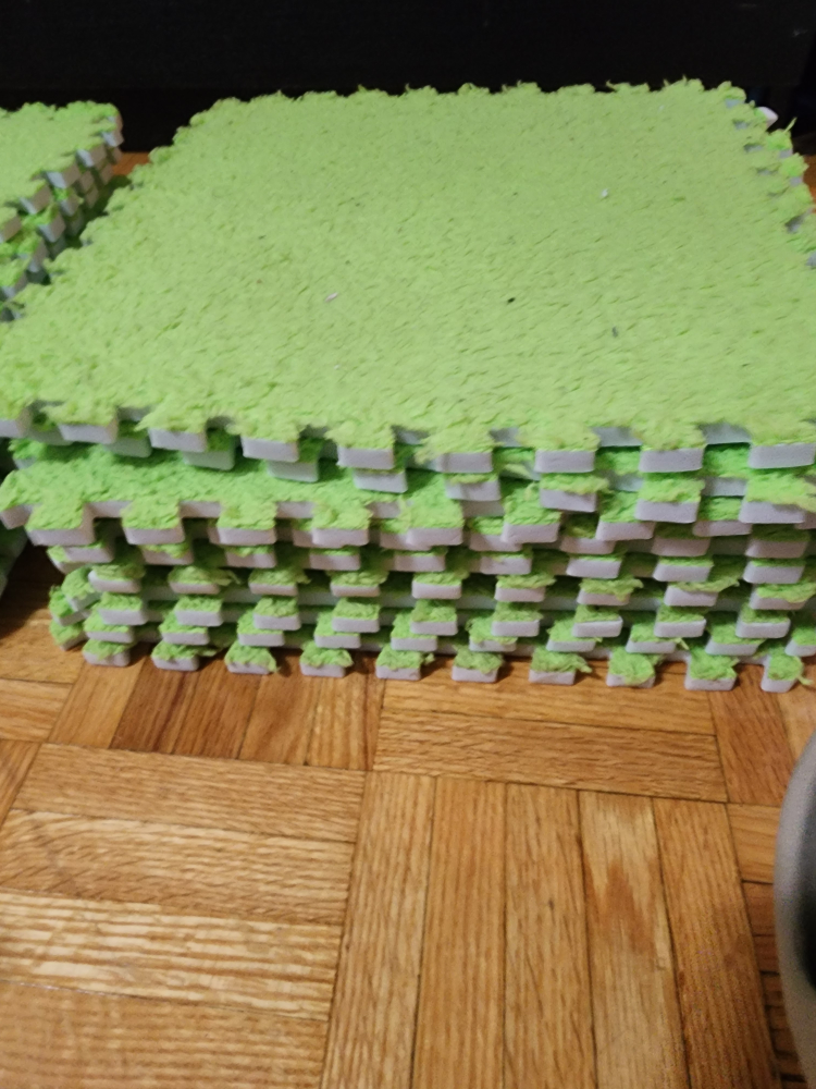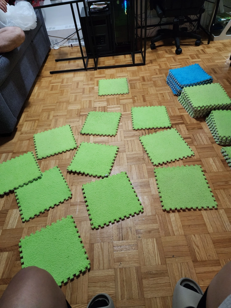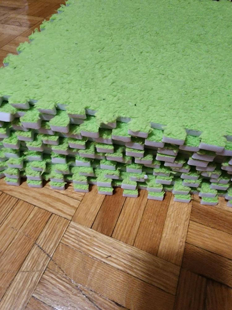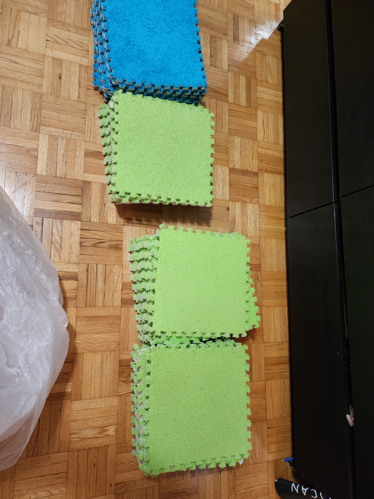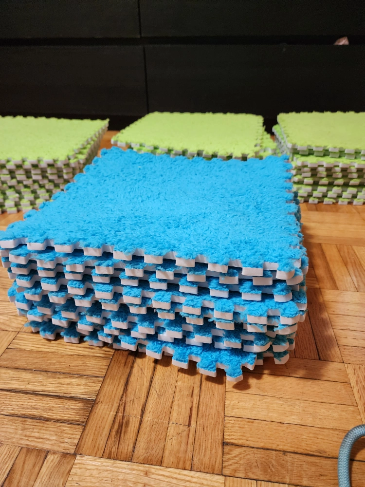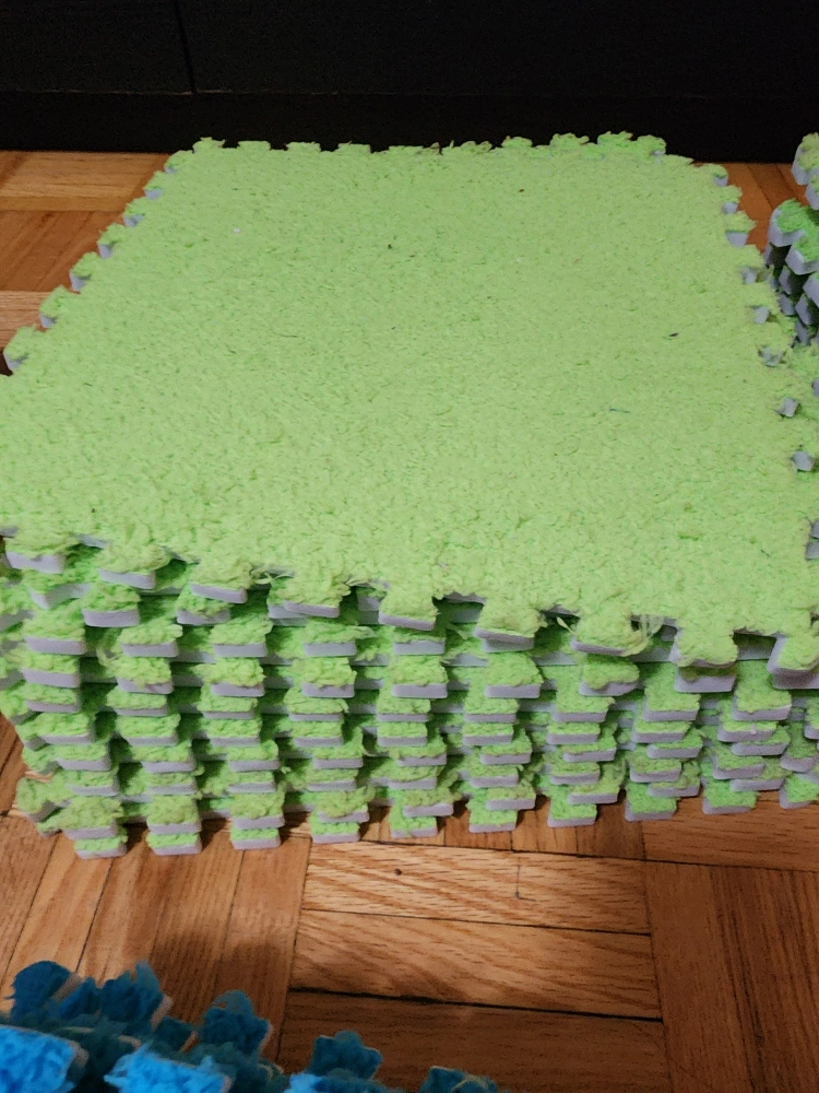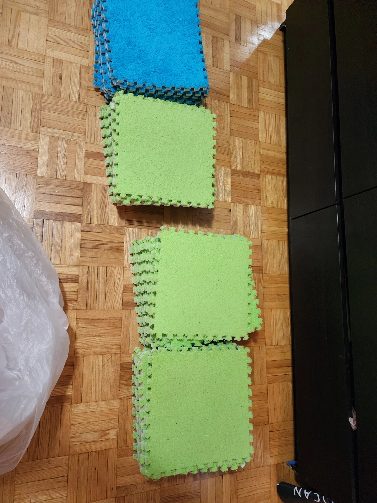 (30 pieces) set of foam puzzle play mat tiles in green and blue! They're great for creating a soft and safe play area for kids. Easy to assemble and clean, these tiles are perfect for playrooms or any space where you need a bit of cushioning
