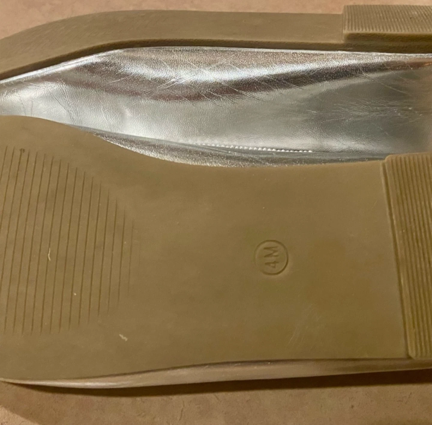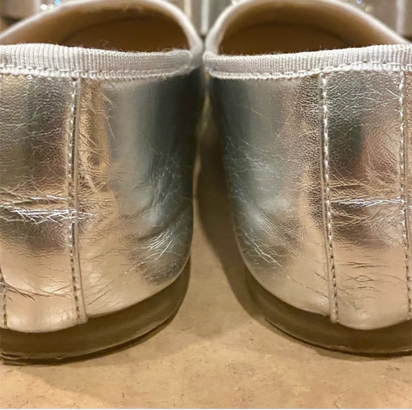 Perfect for dressing up or down. Chic flats with a metallic finish. Features a stylish sparkling bow accent. Ideal for a polished look. Worn once for an indoor event. Size 4