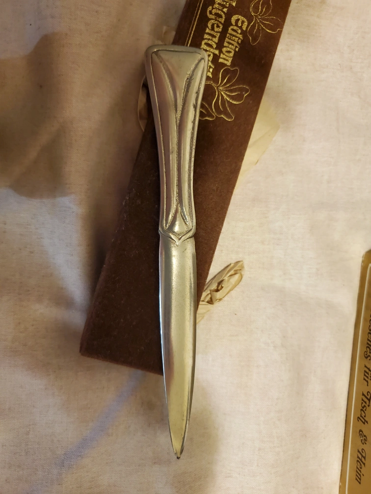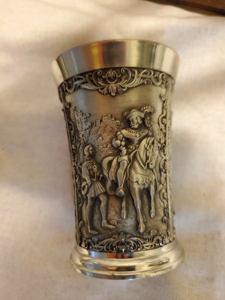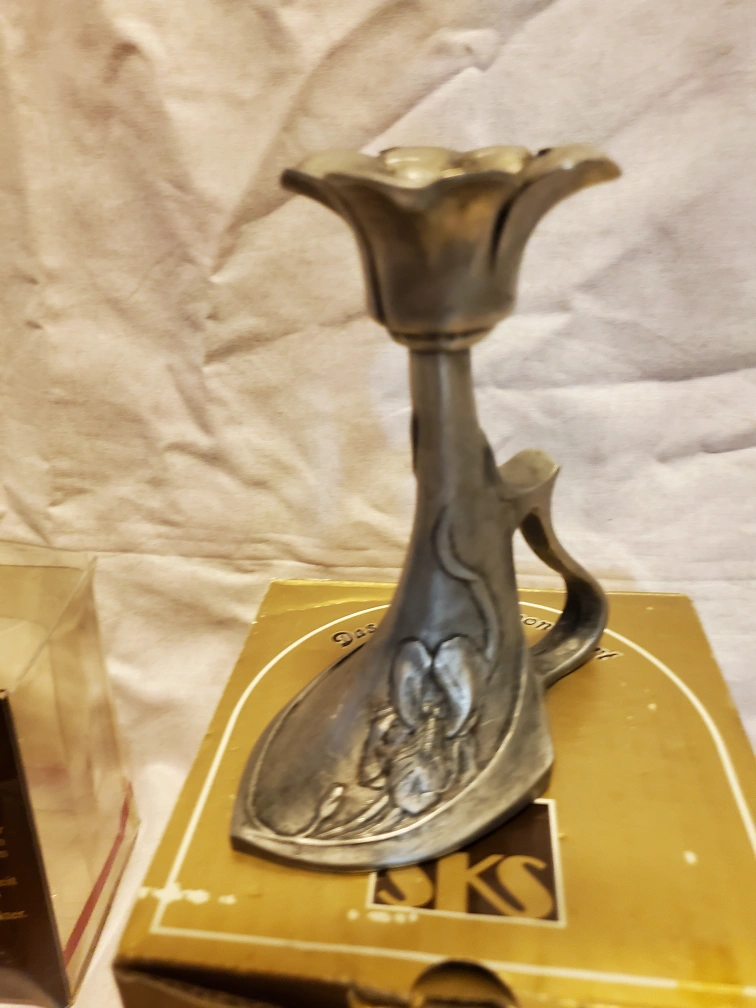 Selling a lovely set of SKS Zinn pewter items. Includes a candlestick holder, a decorative cup, and a letter opener. All in good condition and come with their original boxes!