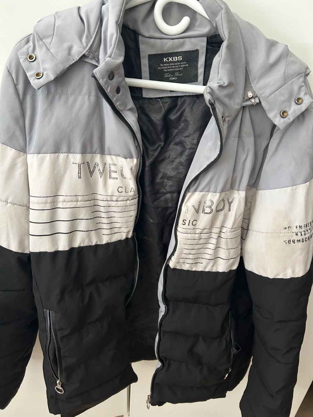 Selling a KXBS padded jacket in a stylish grey, white, and black colour block design. It's in great condition and perfect for staying warm during cooler weather. The jacket features a hood and zipper pockets for added convenience. A fashionable and functional addition to your wardrobe!