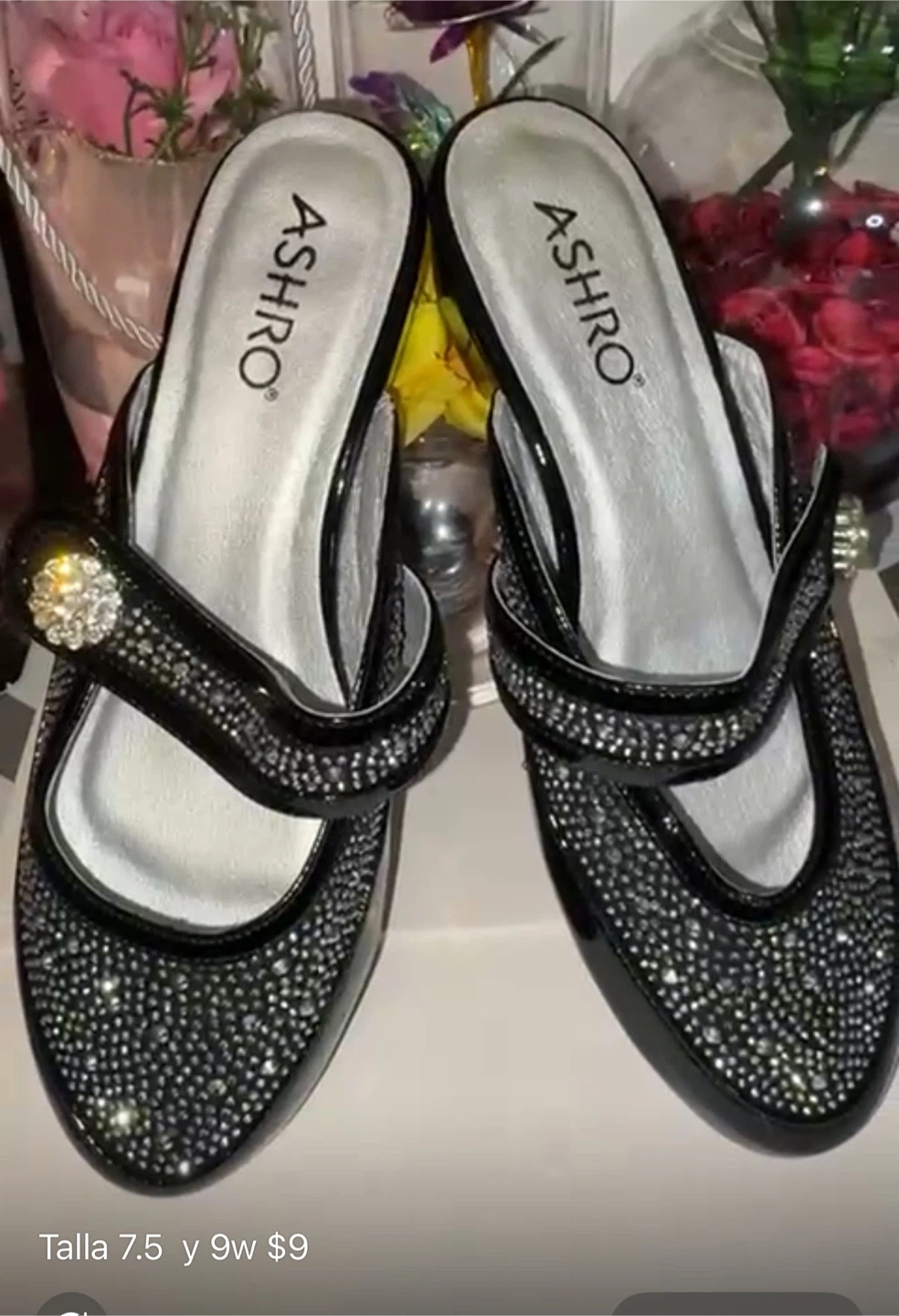 These are a pair of ASHRO black mules, size 7.5. They feature a decorative rhinestone design. They're in great condition and ready for a new home!