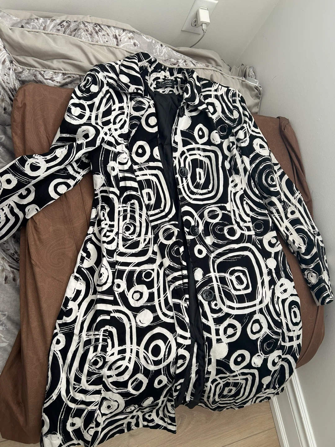 Selling a Tribal coat in a striking black and white pattern. It's a size 12 and features a stretch-extensible fabric for a comfortable fit. Made in Bulgaria, this coat is sure to add a unique touch to your wardrobe