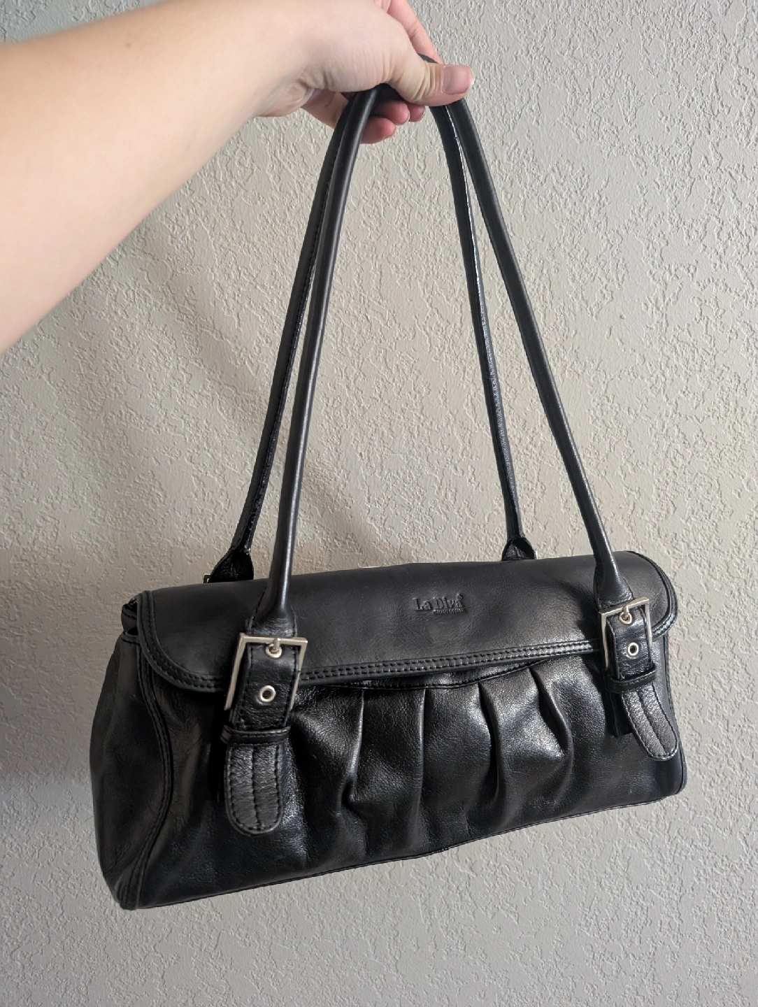 black leather bag. It's in great shape and has a classic look with buckle details. Perfect for everyday use or a night out!