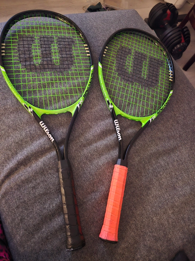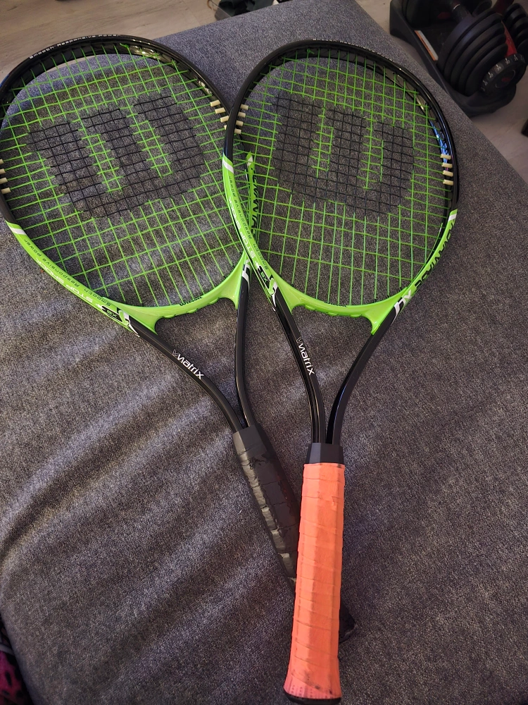 Selling a pair of Wilson Matrix tennis racquets. One has an orange grip, and the other has a black grip. the black grip just needs some grip tape and itll be good as new! cones with 3 balls