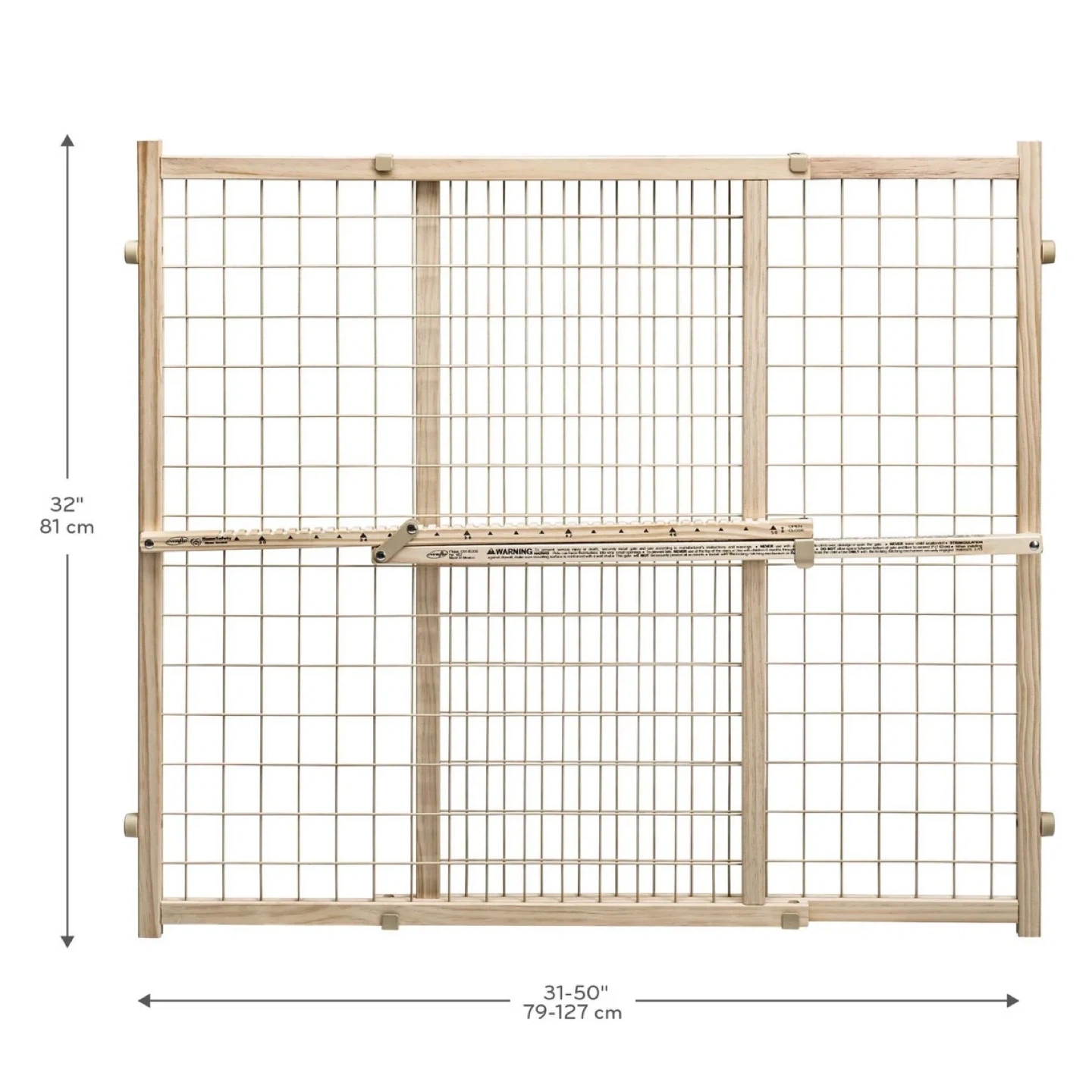 With an extended height and width, this wood baby gate accommodates a broad range of openings from 31 in to 50 in (79 cm to 127 cm) wide and is 31 in. (79 cm) tall. This pressure-mounted baby gate features a simple lift and lock installation method that installs/un-installs with ease. Convenience makes this wide baby gate a good choice for the most basic use.