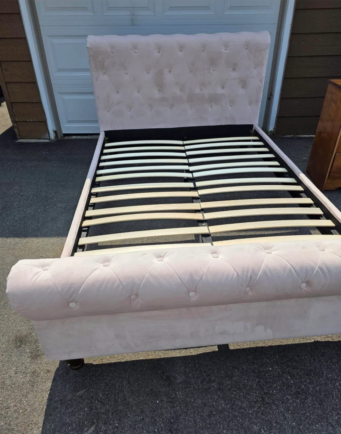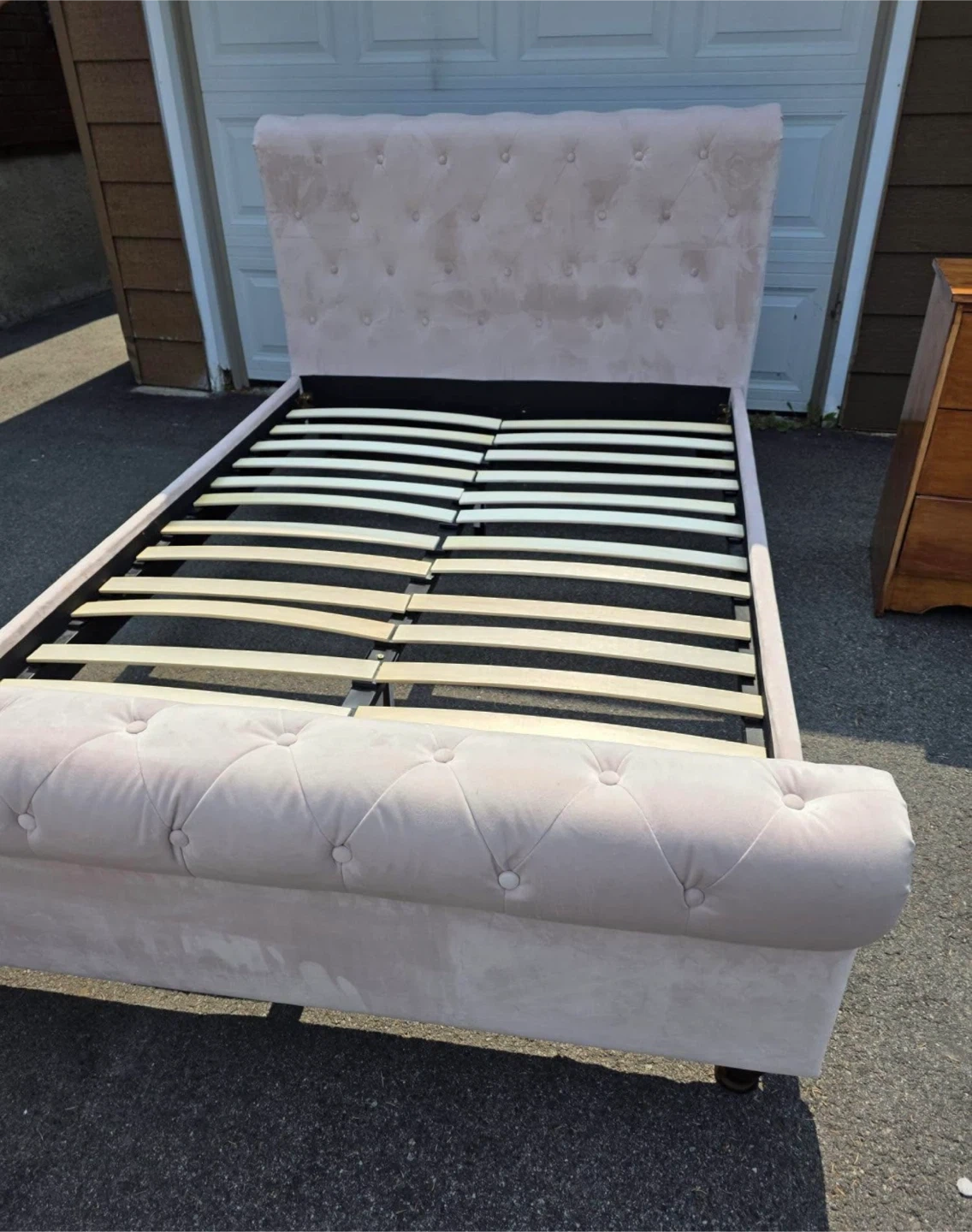 Selling a lovely light pink tufted bed frame! It's in great condition and would add a touch of elegance to any bedroom. The tufted detailing is beautiful and the colour is very soft and calming good condition home delivery available