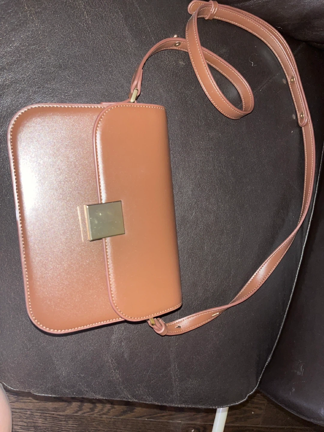 Selling a stylish brown leather shoulder bag. It features a classic design with a gold-tone clasp and an adjustable shoulder strap. Perfect for everyday use!
