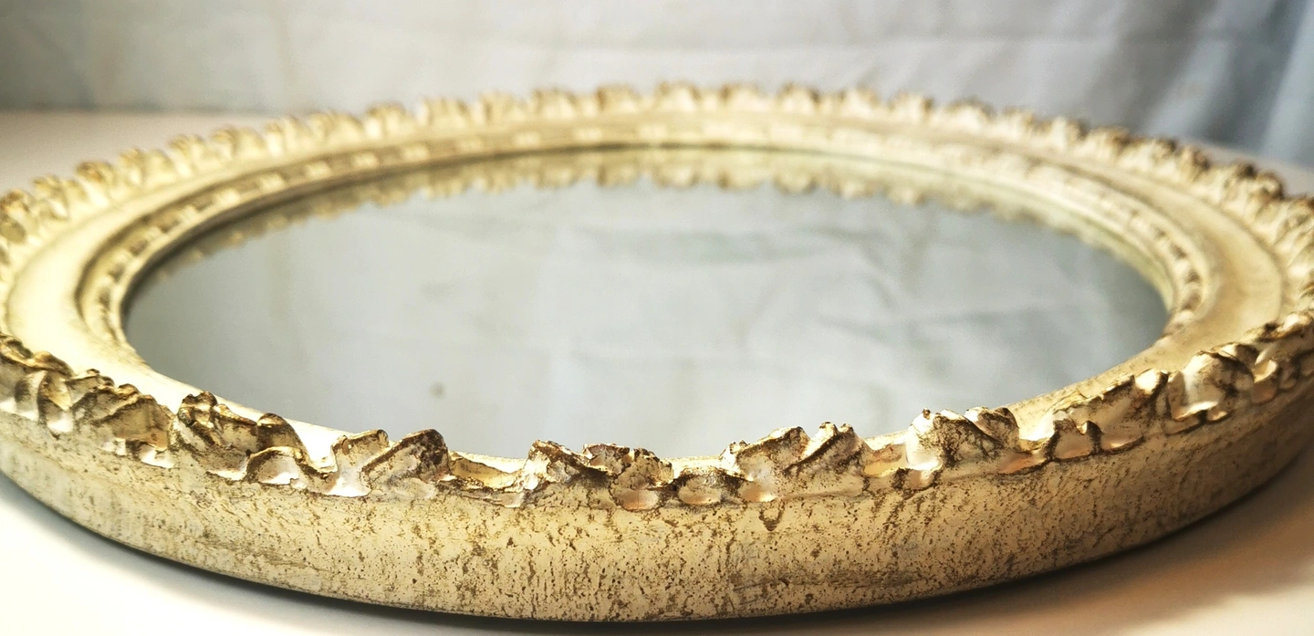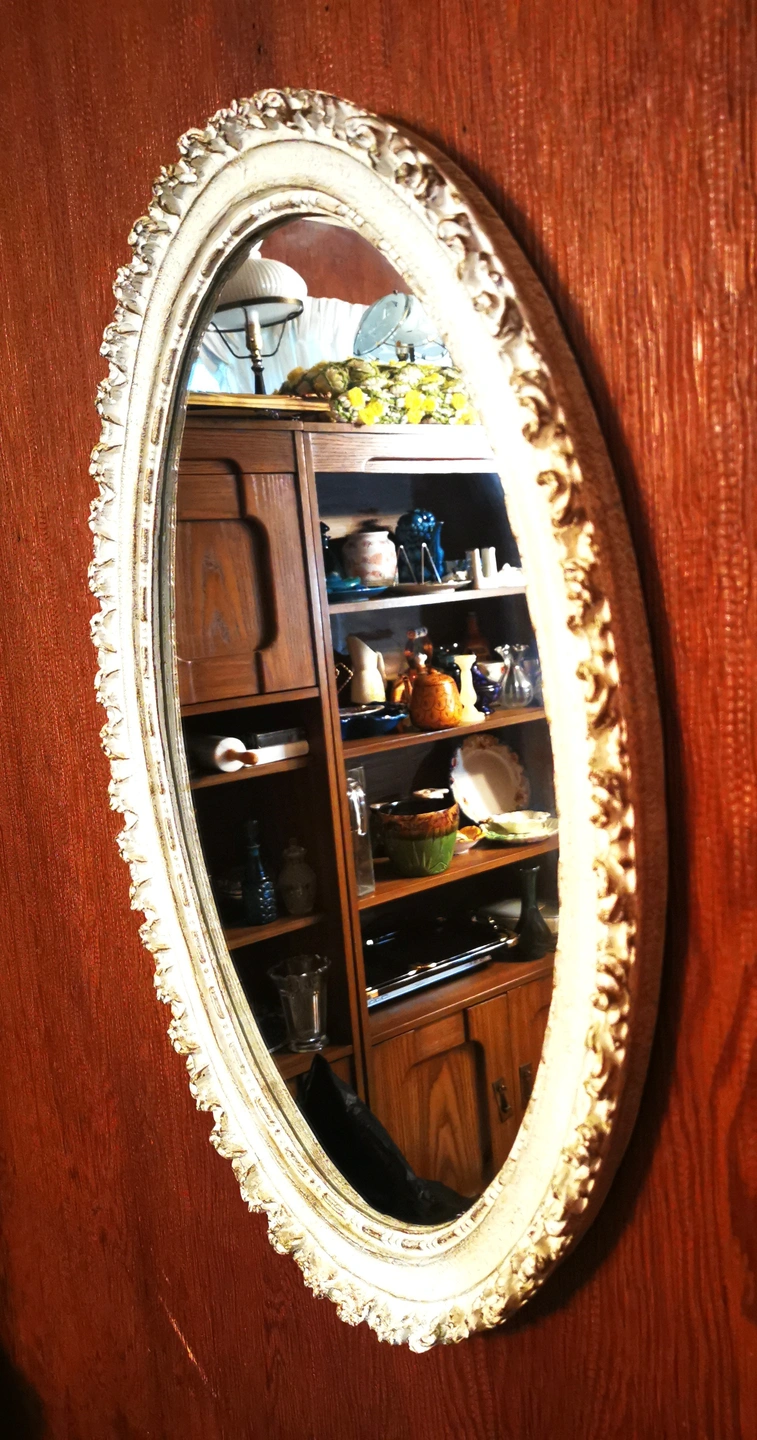 The product is a vintage oval mirror with ornate detailing, manufactured by Artlight Co. Ltd. in Canada. This collectible piece of adornment serves as a unique decorative item for collectors of vintage memorabilia. The intricate design and country of manufacture add to its appeal as a charming addition to any space. Dimensions: Length 22.5 inches, Width 16.5 inches, Depth 1.5 inches Condition: Good vintage condition light wear, blemish on the rear. Please reference detailed photos as part of the description