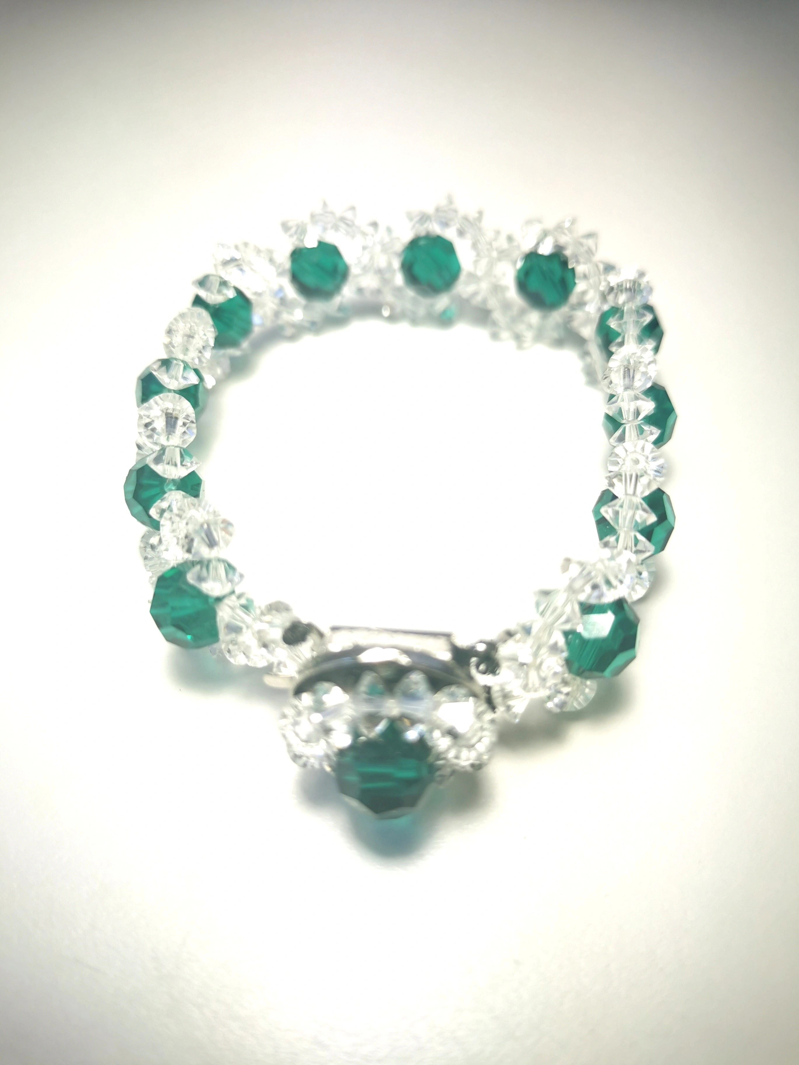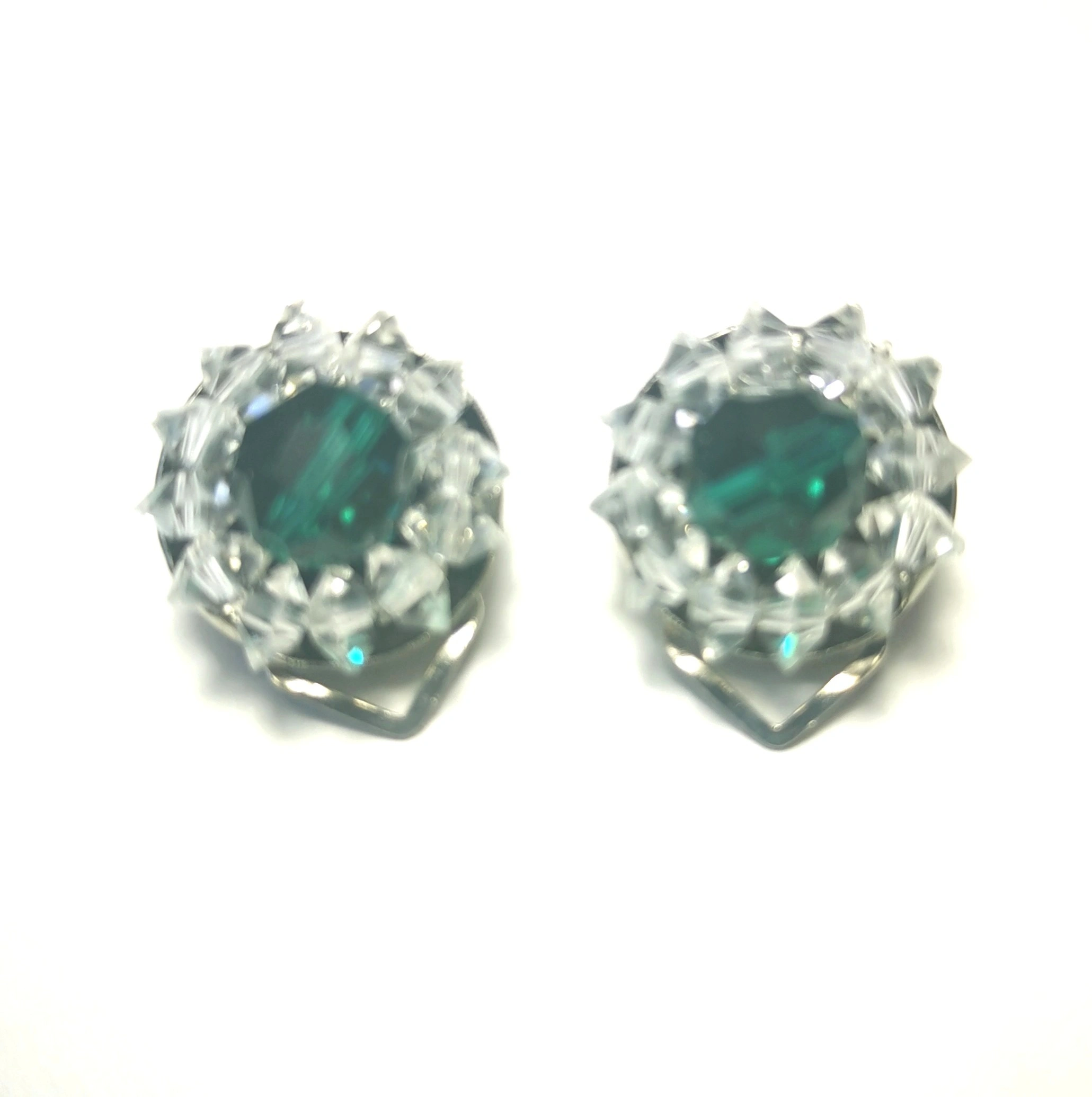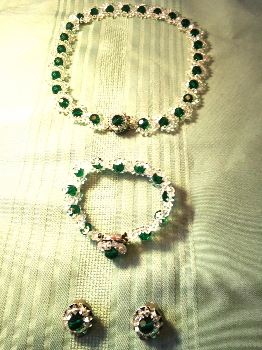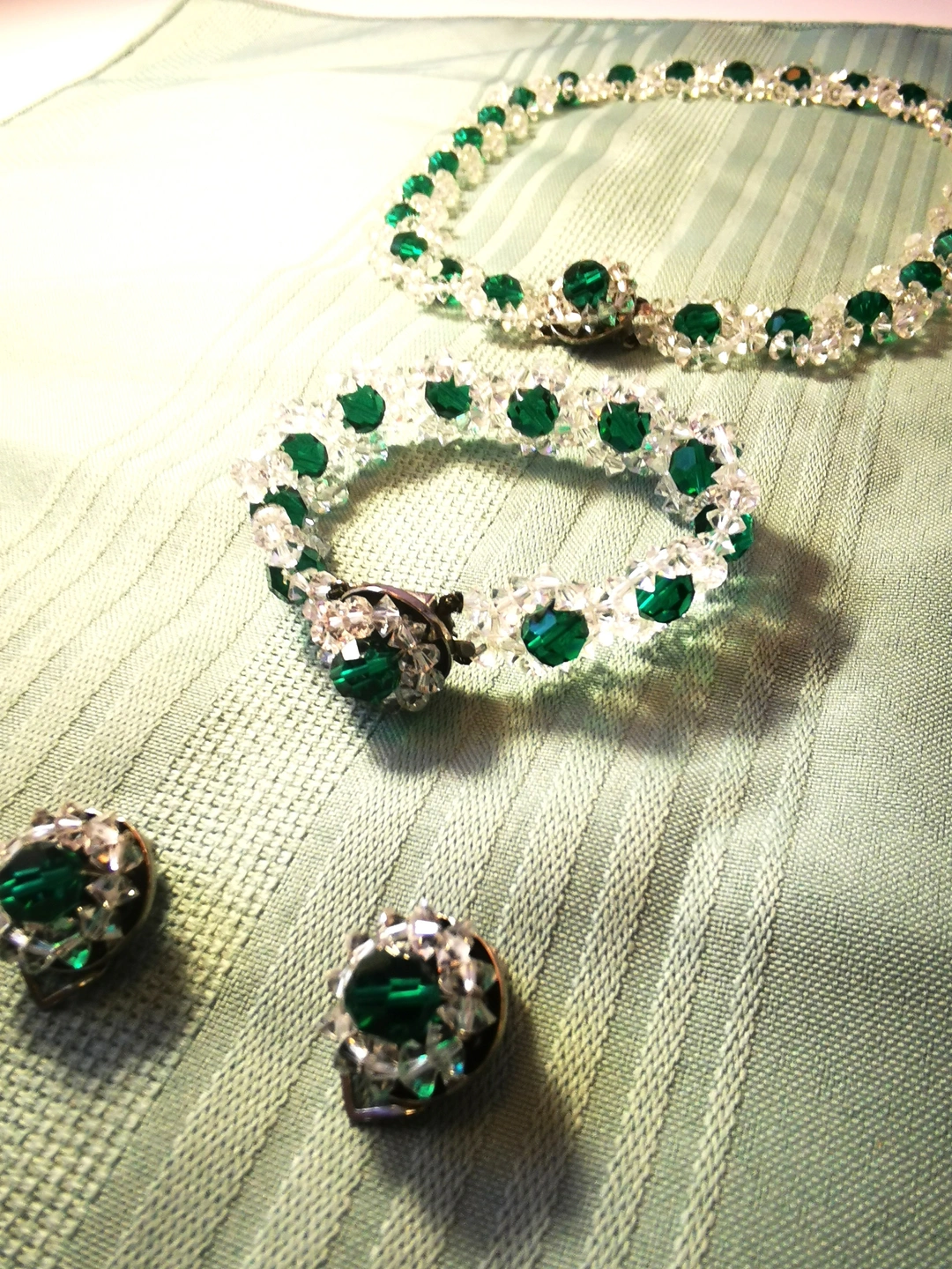 62Add timeless sparkle to your collection with this stunning three-piece crystal jewelry set, featuring a beautifully coordinated necklace, bracelet, and earrings. Each piece showcases rich emerald-green crystal beads surrounded by intricate clear crystal accents, creating a luxurious and eye-catching design. Perfect for special occasions, weddings, or evening events, this set combines elegance with comfort. The necklace and bracelet are lightweight and easy to wear, while the matching earrings complete the sophisticated look. Handcrafted with attention to detail, this set makes a gorgeous gift or a glamorous addition to your own jewelry wardrobe. Features: Complete set: Necklace, bracelet, and earrings clip on Quick release and closure Premium-quality sparkling crystal beads Rich emerald-green accents Handcrafted design Ideal for formal events, weddings, parties, and gifts ✨ Shine with timeless elegance✨ CONDITION: Good vintage condition light wear as to be expected please reference photos as part of the description. Dimensions: Necklace 17 inches long, Width .75 inches Bracelet 7.5 inches long, Width .75 inches Earrings .75 inches diameter all approx.