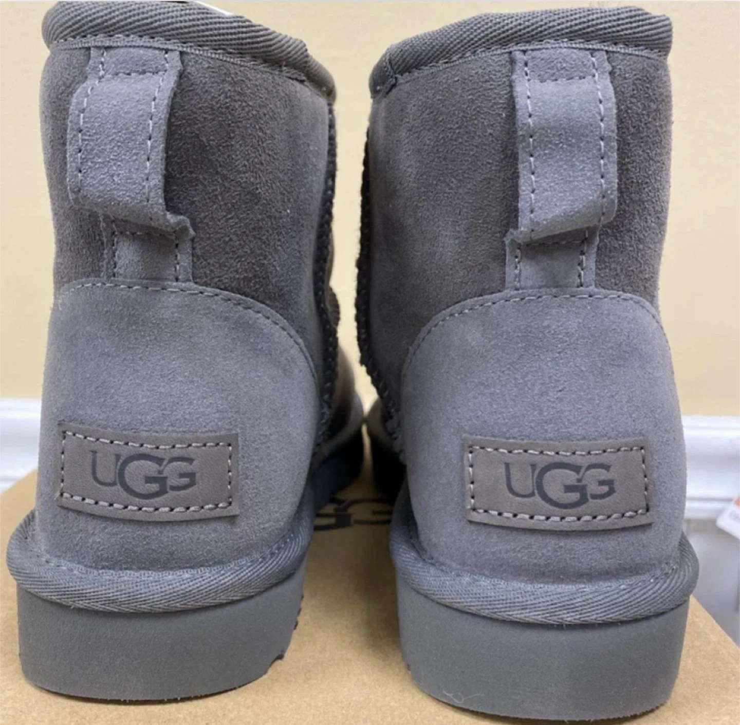 Selling a pair of UGG mini boots in size 7. They are a stylish gray color and come with the original box! Perfect for keeping your feet warm and cozy