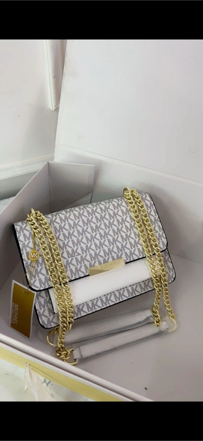 Selling a brand new Michael Kors chain bag! It features the classic MK logo pattern in white and grey, with gold-tone chain detailing. Comes with its original box