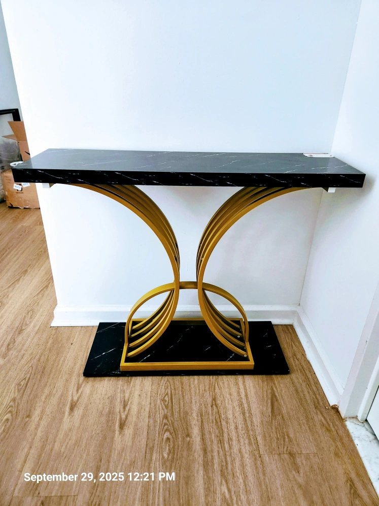 Selling a stylish console table with a black marble faux top and a unique gold finish base. It's a great accent piece for any entryway or living room. The table is in excellent condition and ready for a new home!
