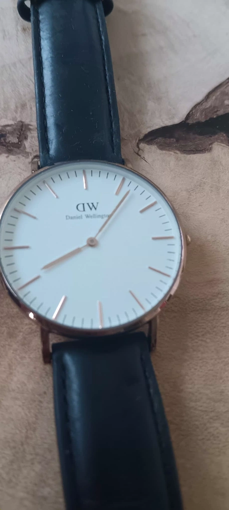 Selling a Daniel Wellington watch with a black leather strap. It's a classic and timeless piece that would look great with any outfit. The watch is in good condition and has been well taken care of. It does require new batteries