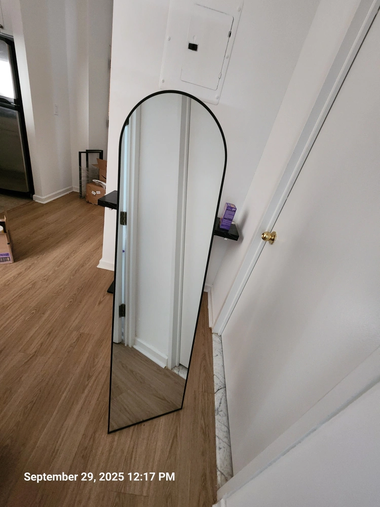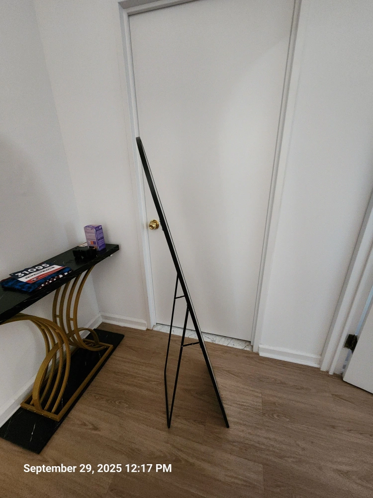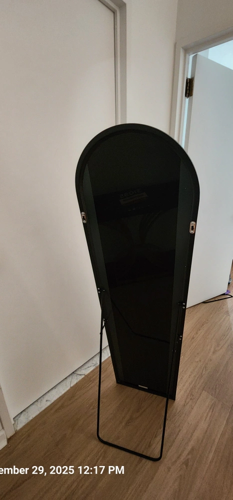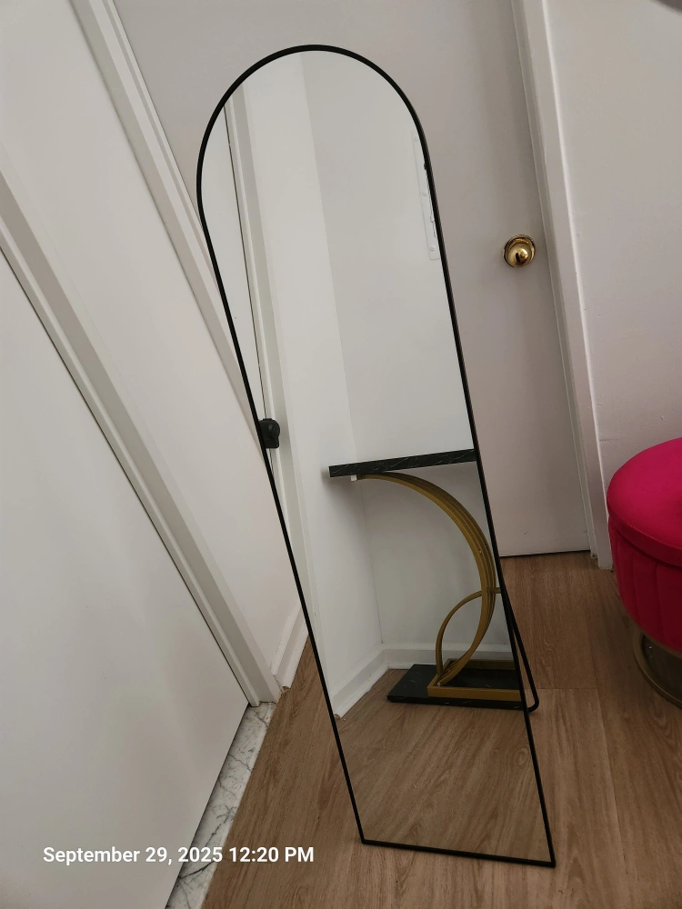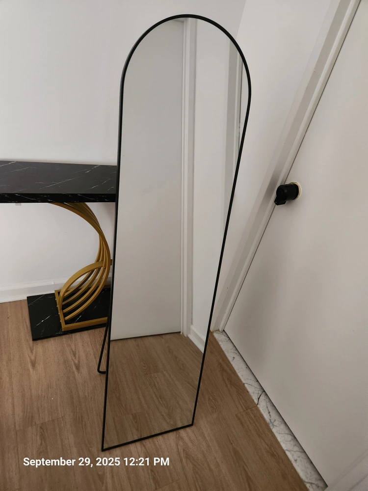 Selling a full-length mirror with a sleek black frame. It's in great condition and ready to brighten up your space! This mirror features a minimalist design that complements any decor. Notes: Excellent condition. Like new and assembled. Pied-à-terre. Remodeling.