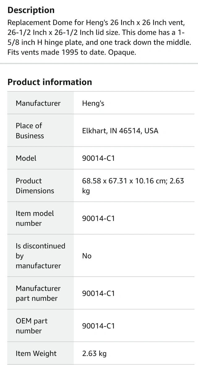 New replacement dome for sale, brand new, still in the box. Measures 26"X 26". Please view the photos for more information. Asking $70, let me know. Thank you