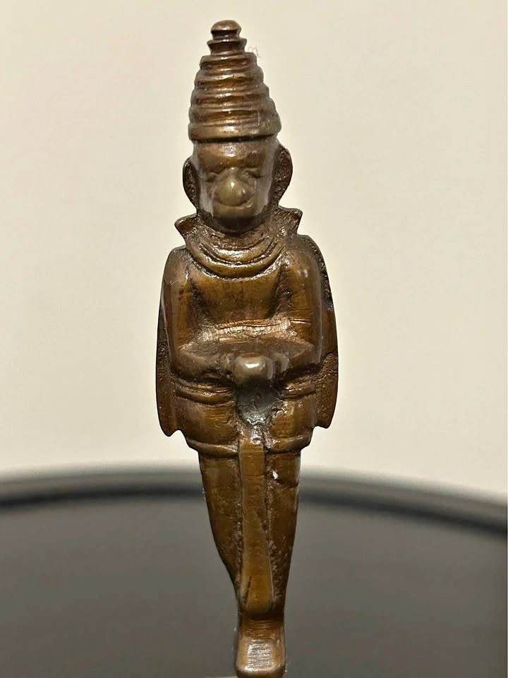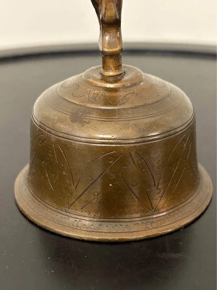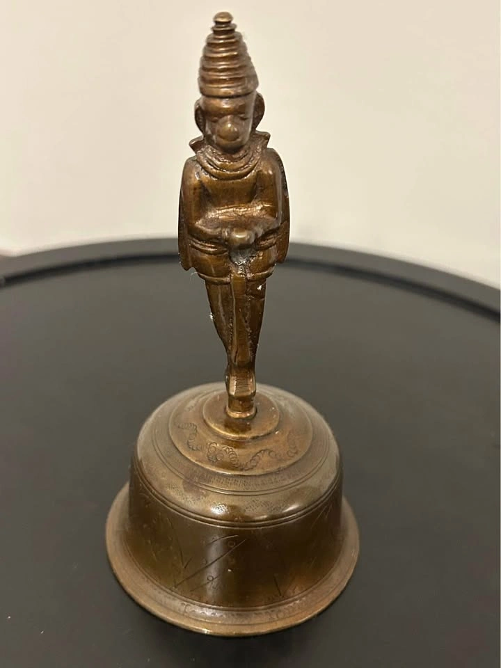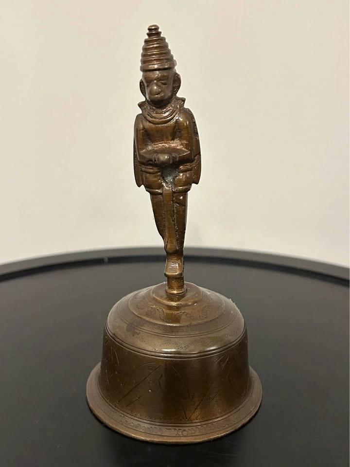 Antique Indian brass temple bell with a unique two-faced deity figure as the handle, possibly linked to Hindu Hanuman or other protective temple iconography. The bell body is decorated with engraved motifs, and the original clapper is intact. Produces a clear ritual tone. Traditionally used in Hindu temples and puja ceremonies, this piece also makes a striking collectible or decorative accent for an ethnographic or spiritual collection. Pick up: Seton area, Calgary. See also my other lots. Open to your questions and suggestions. If necessary, I provide additional photos. These are not new things, so please look carefully at the photos and videos. Sizes are submitted on request and also using a tape measure in the photo.