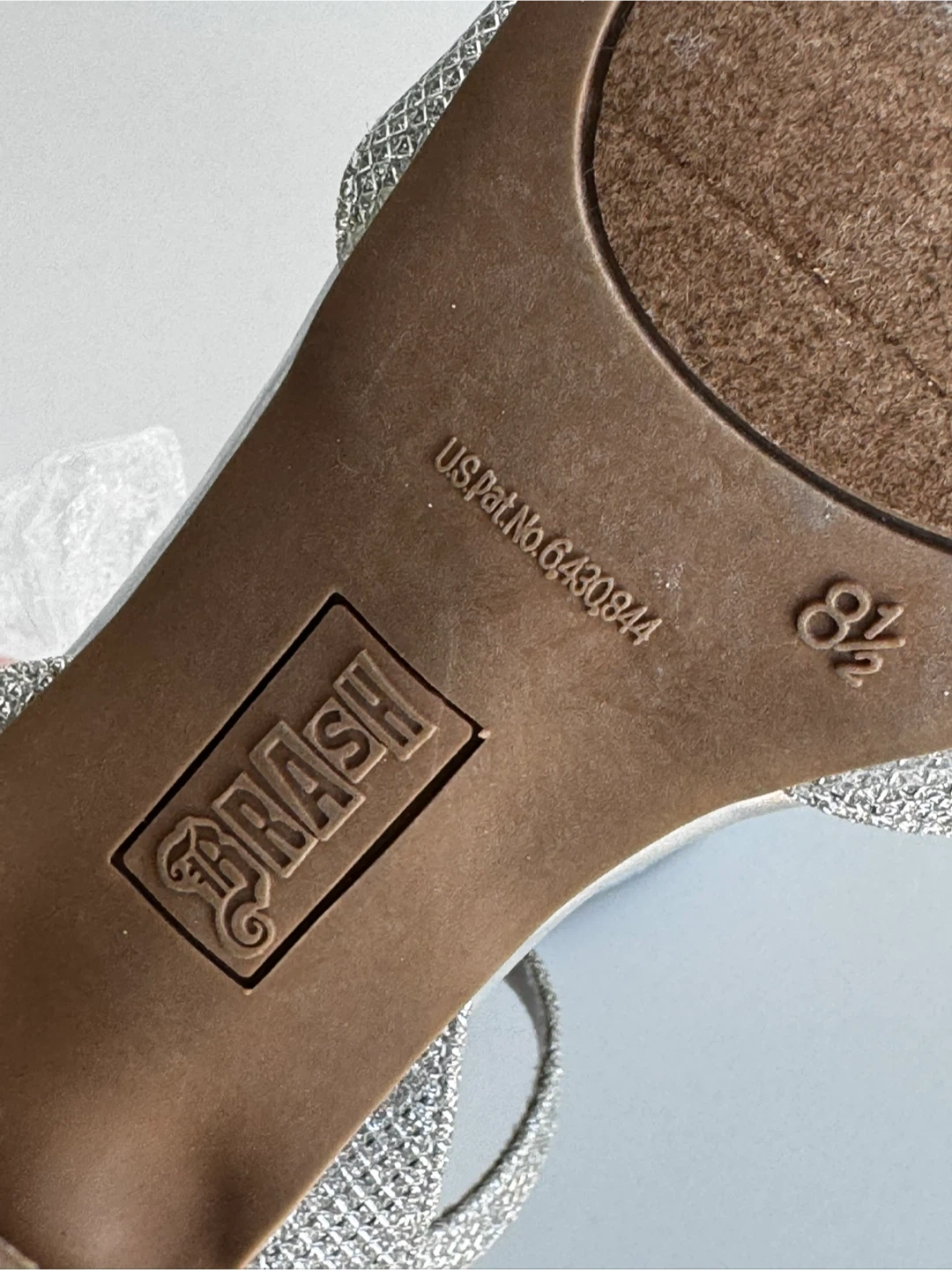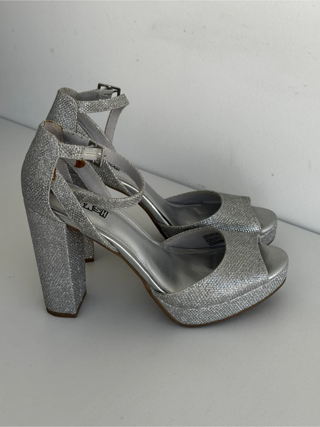 Selling a pair of Brash heels in a sparkly silver glitter! These are a size 8.5 and feature an open toe and ankle strap. Perfect for a night out or special occasion!