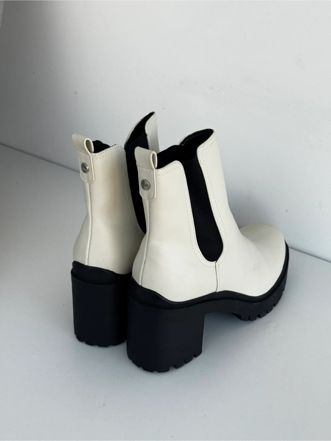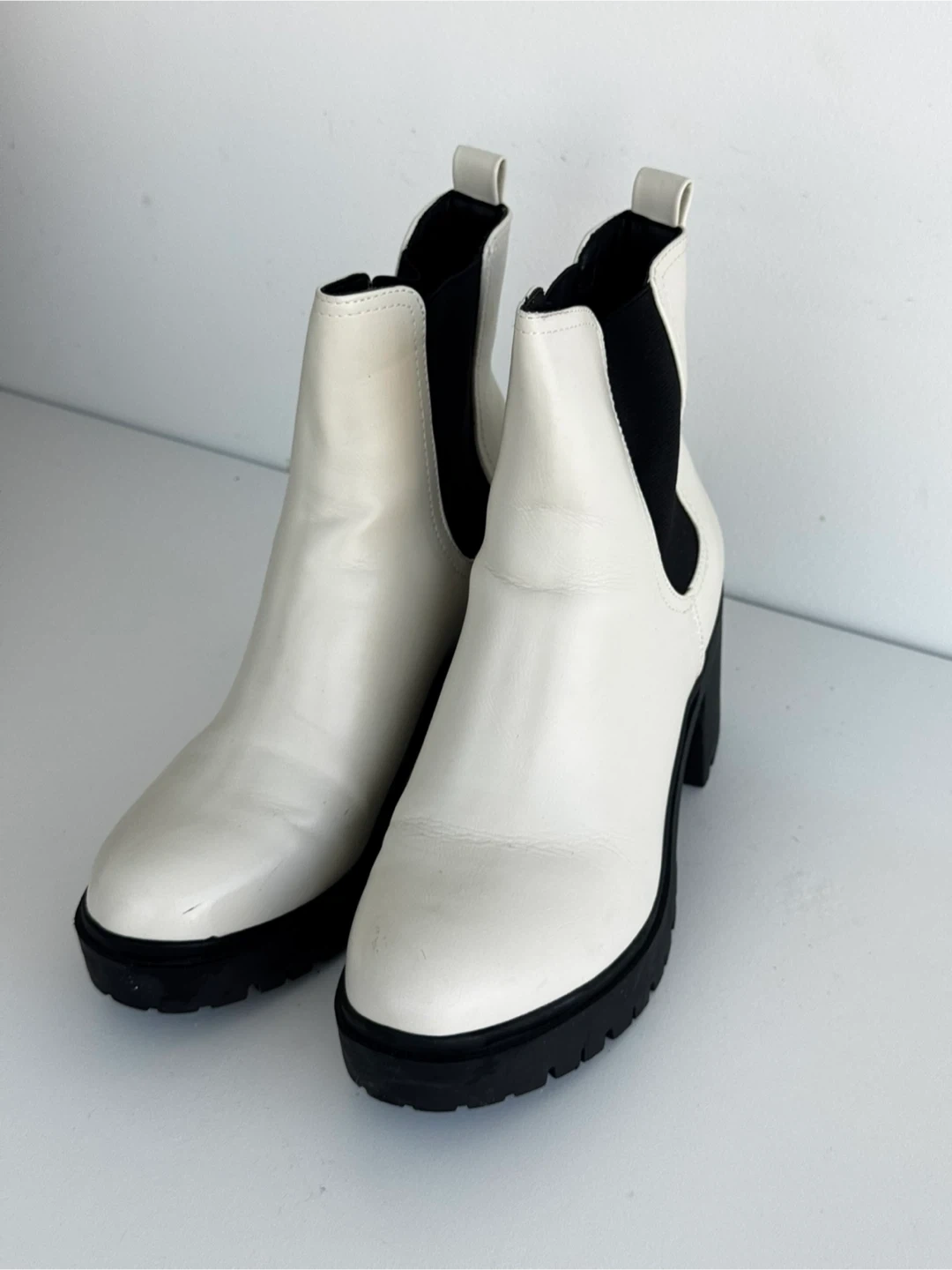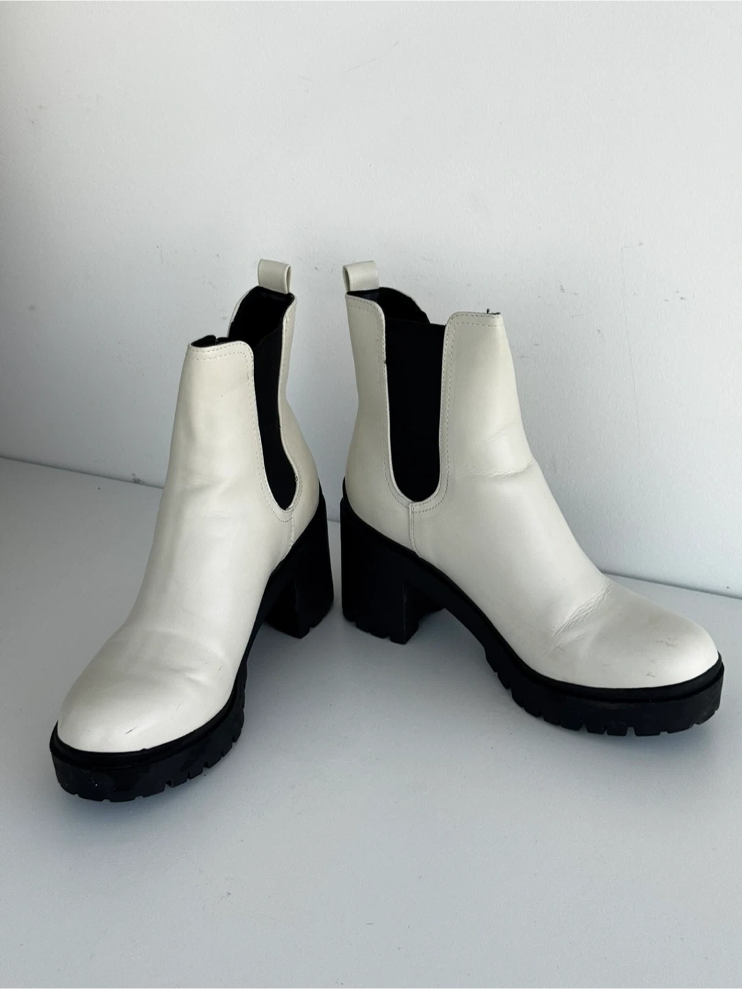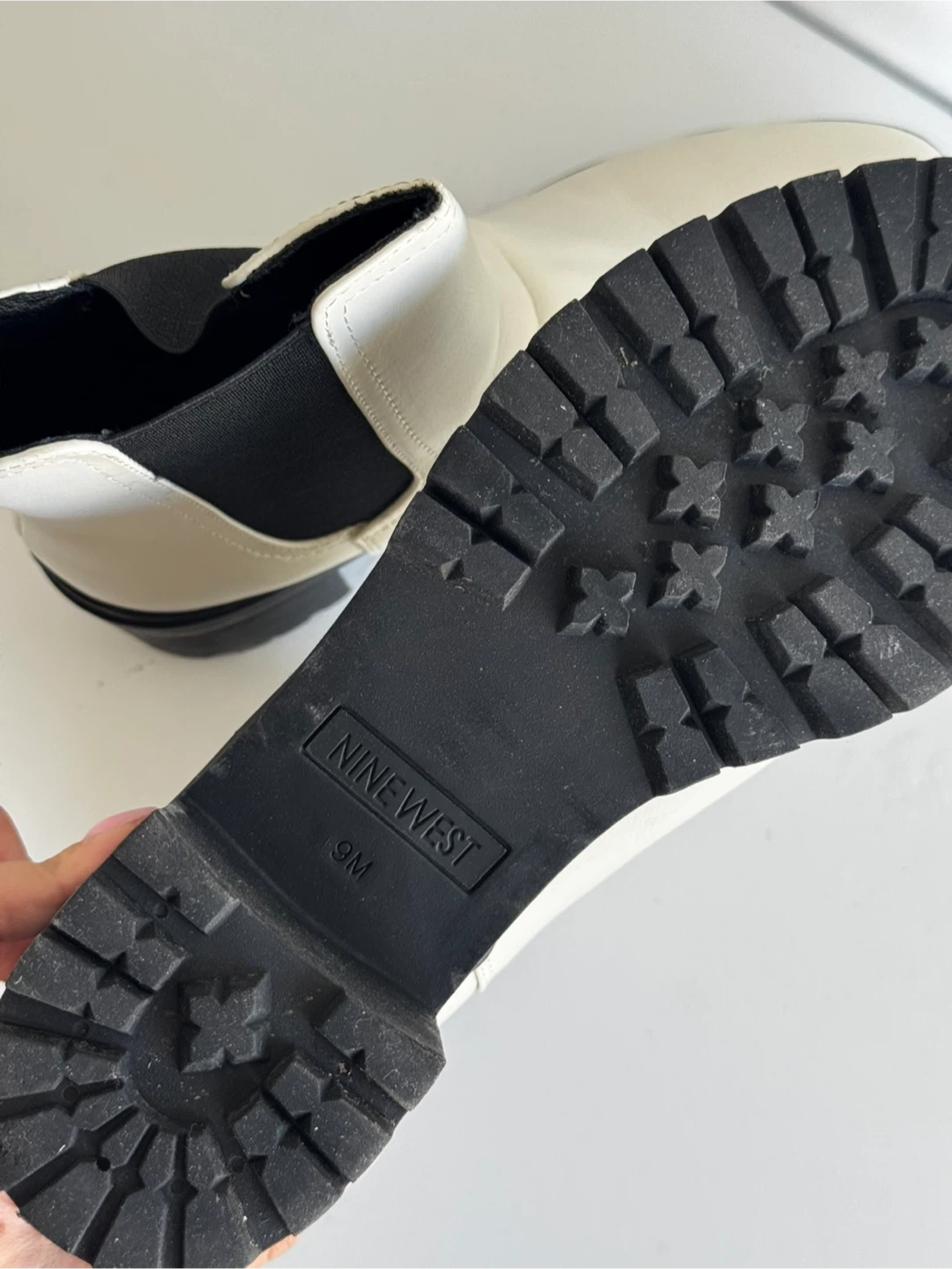 Selling a pair of Nine West Chelsea boots in a lovely white leather! They are a size 9 and have a chunky black sole and heel. These boots are in great condition and would be a stylish addition to any wardrobe
